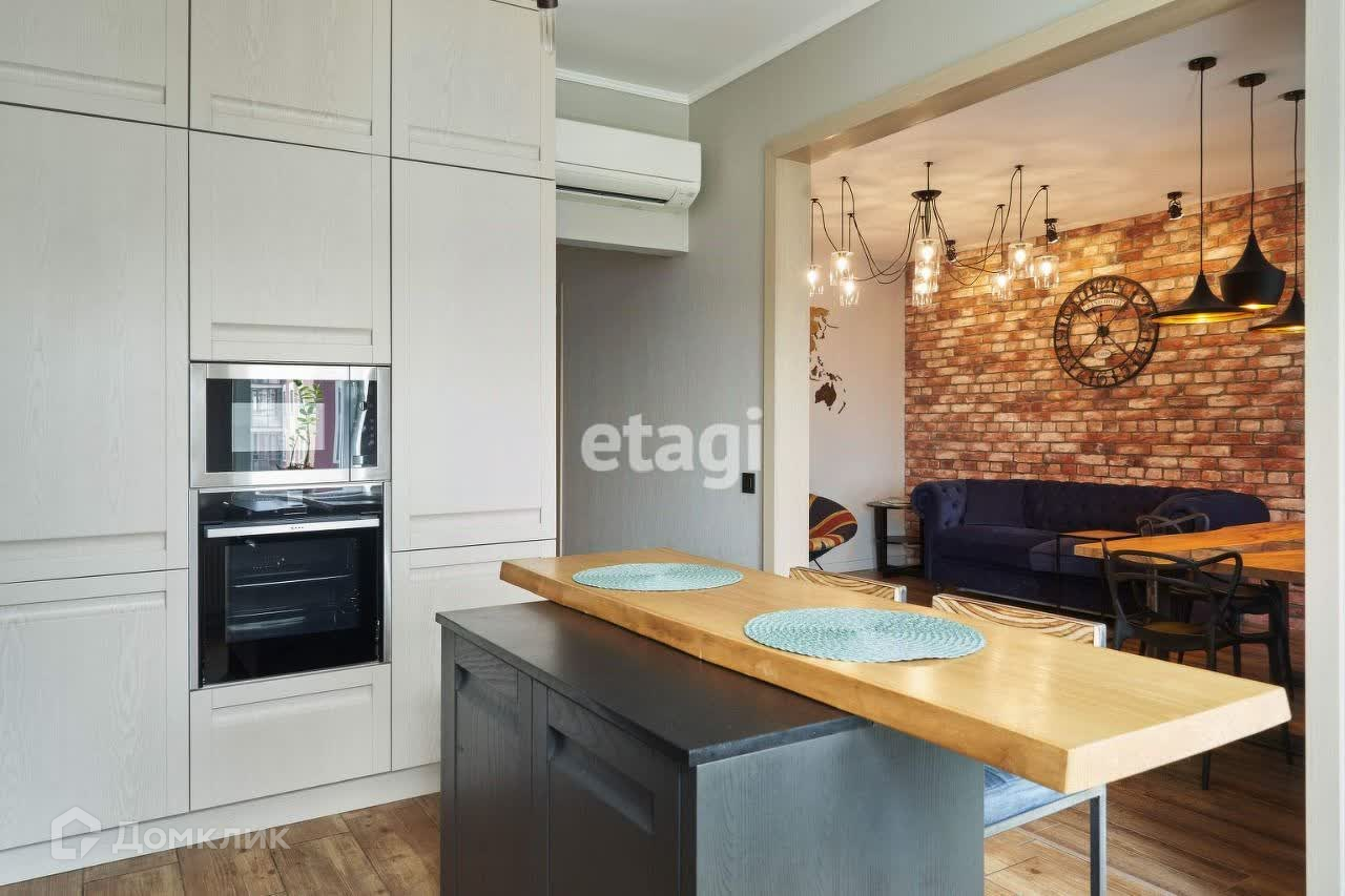 В кухне, помимо большой рабочей зоны, есть кухонный остров, а в гостиной организована зона столовой с дизайнерским столом на шестерых.