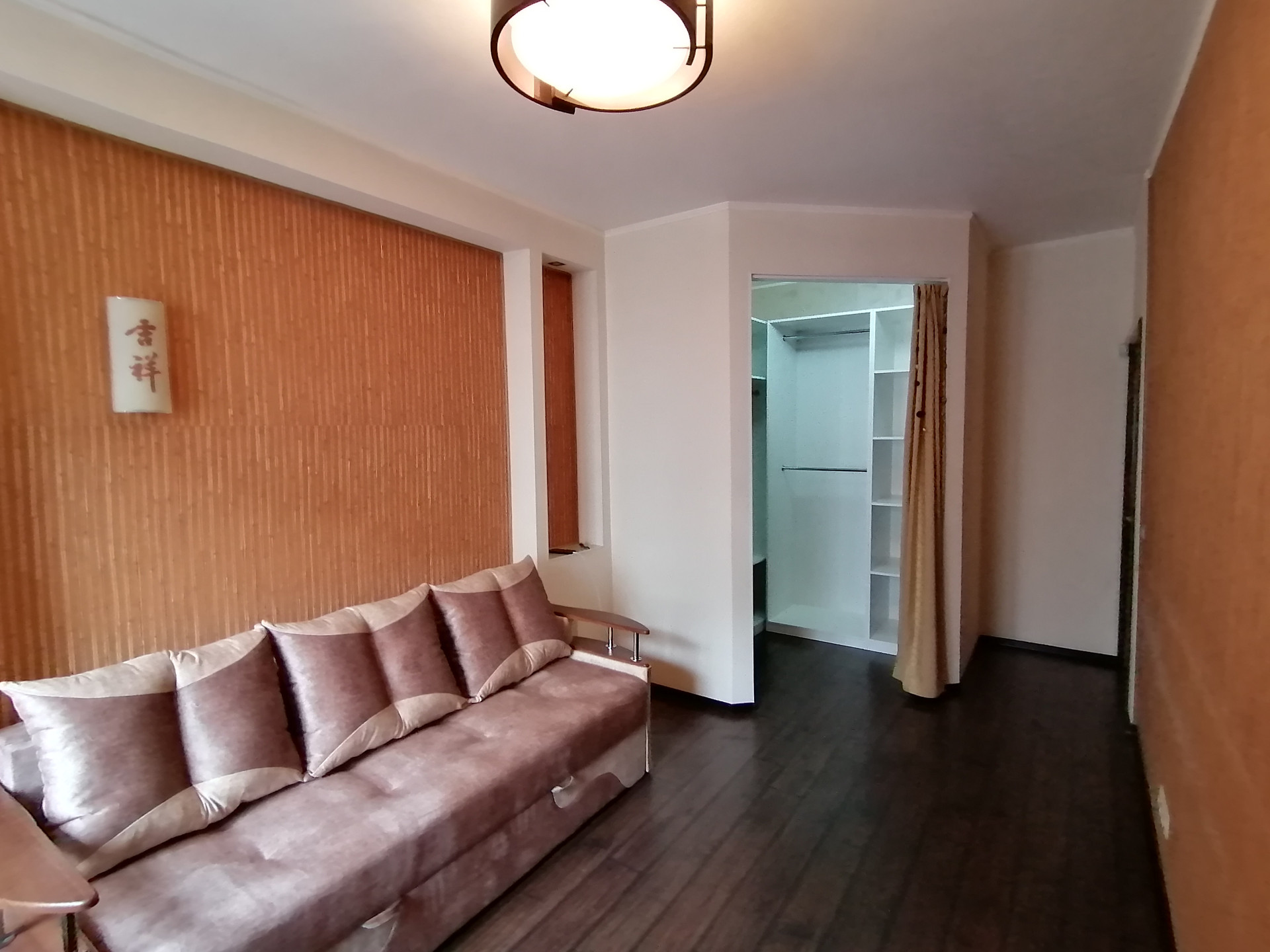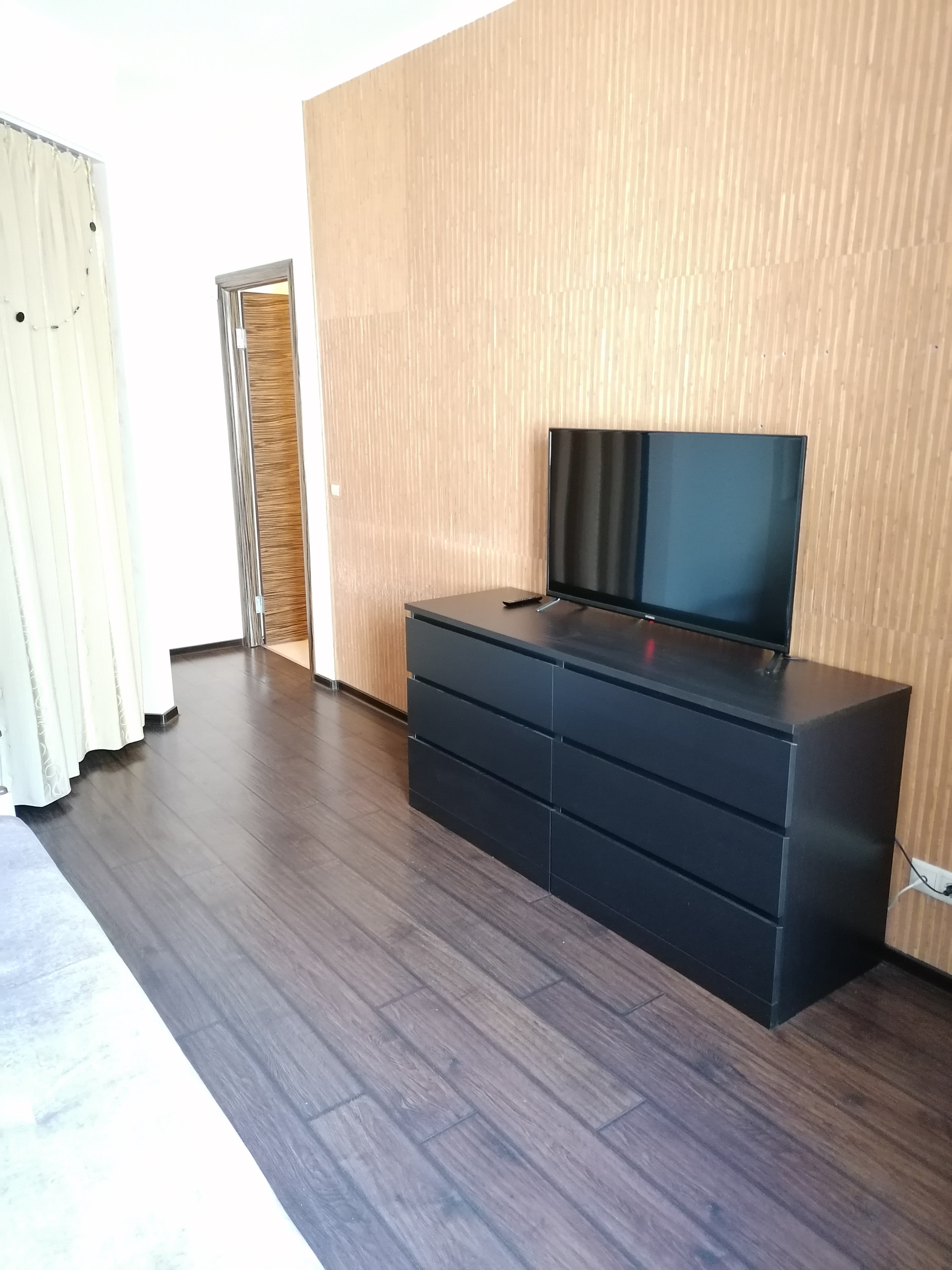 В квартире двухспальная кровать и раскладной диван (1,40 м), комод, телевизор. Гардеробная со встроенными шкафами.