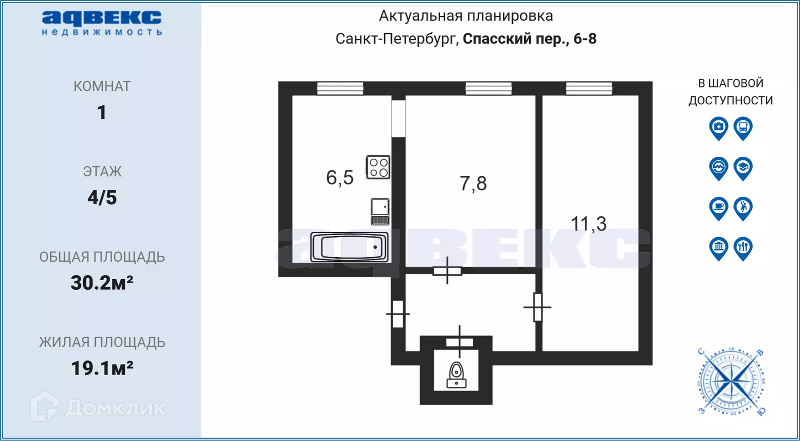Общая площадь 30.2 м2