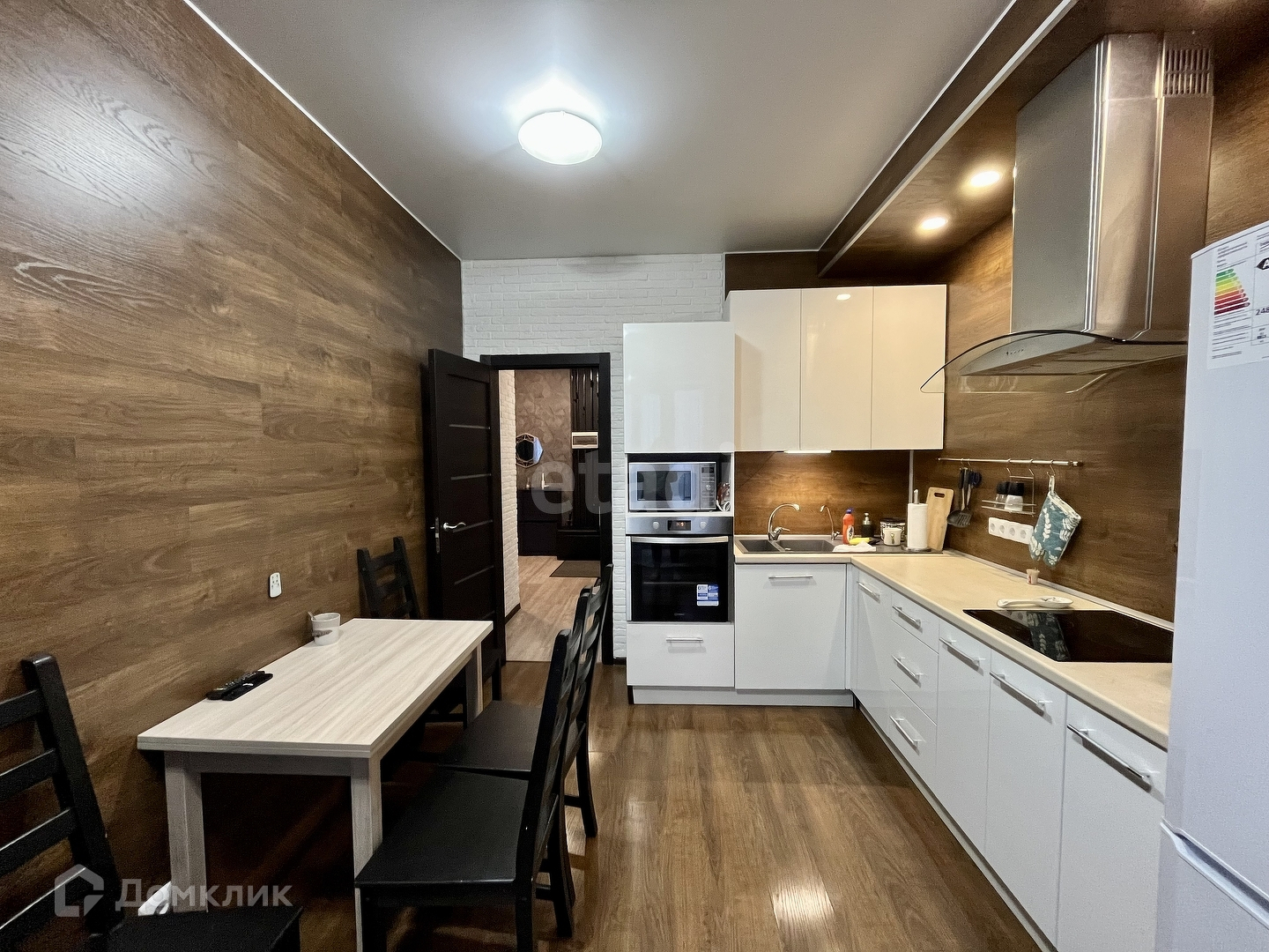 Просторная кухня оборудована качественной техникой и мебелью: электрическая варочная панель, духовой шкаф, посудомоечная машина, микроволновая печь, фильтры для питьевой воды, телевизор, вытяжка, обеденный стол и стулья, диван. С кухни имеется выход на одну из лоджий с панорамным остеклением.
