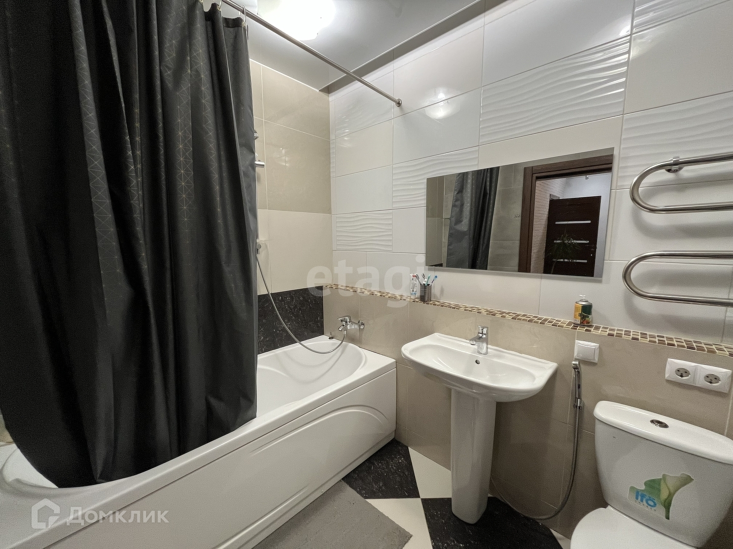Совмещенный санузел с ванной, полотенцесушителем, полками для хранения.