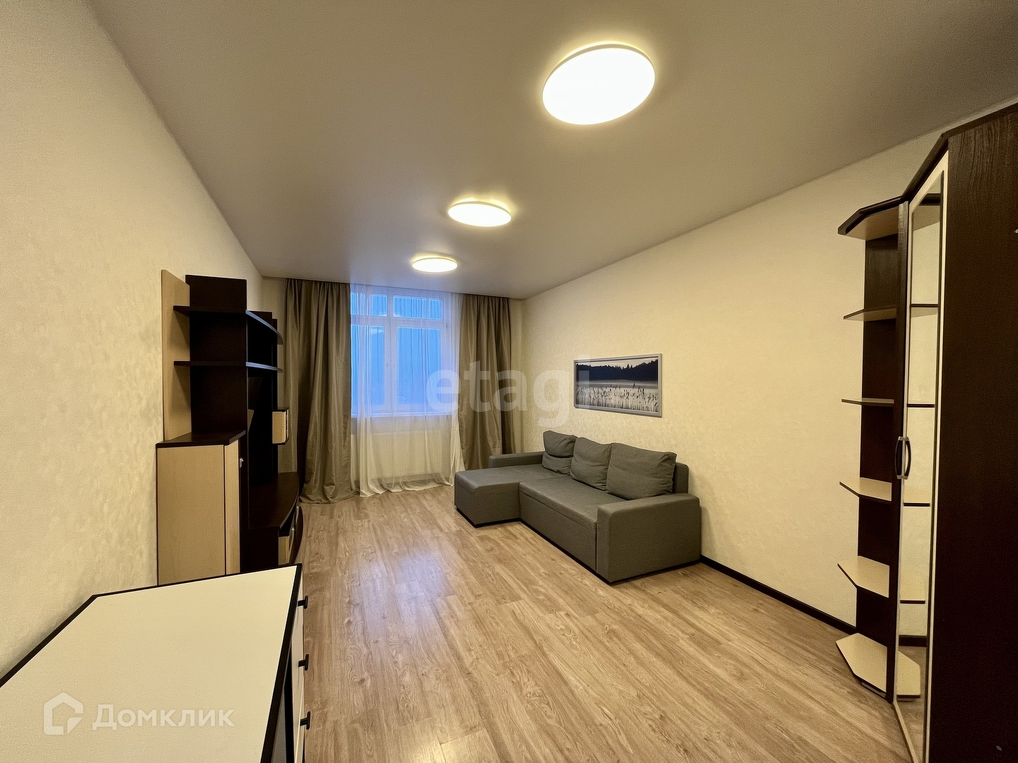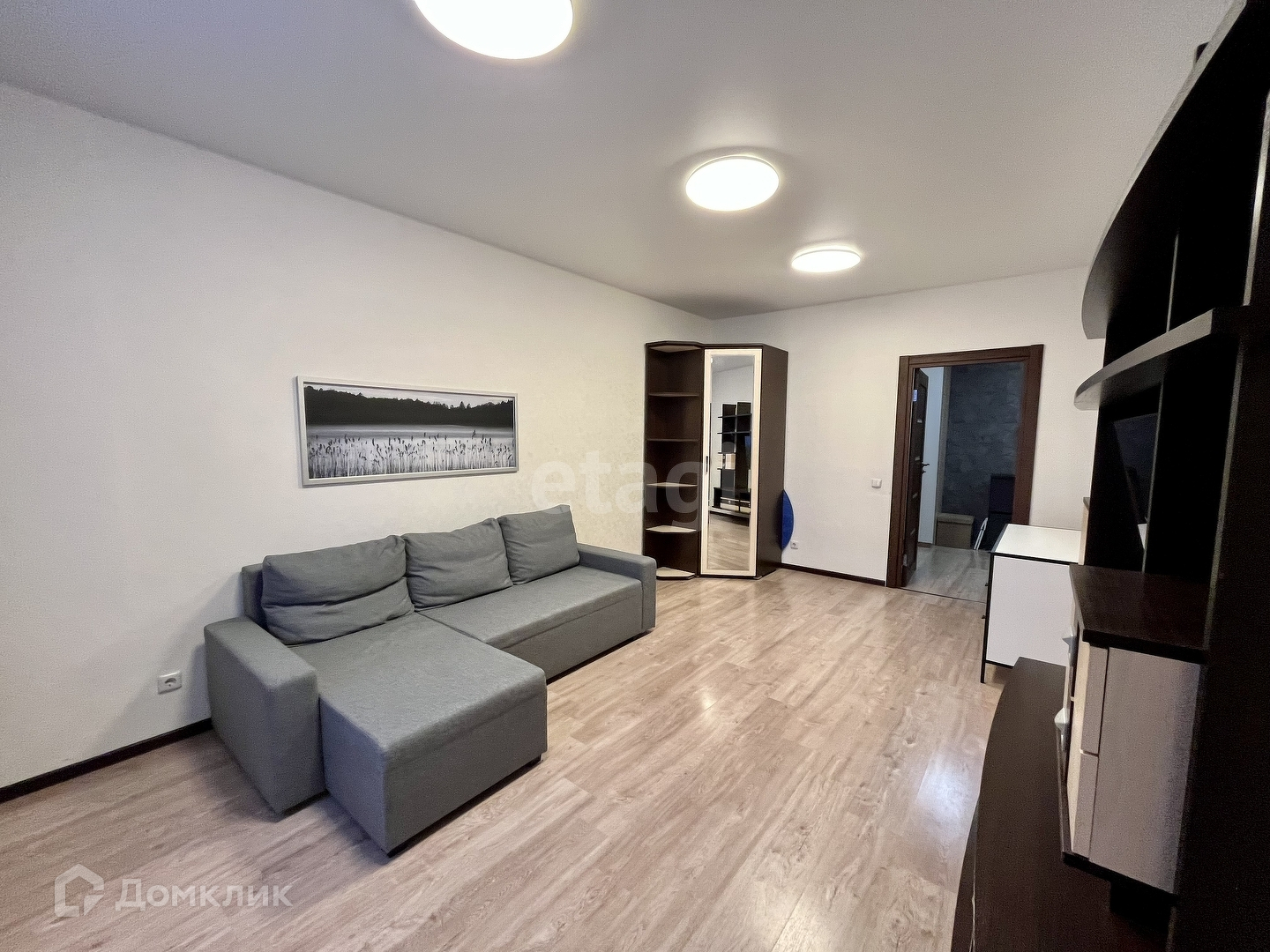 Гостиная включает шкаф, угловой диван, который с легкостью раскладывается, стенка под ТВ и телевизор.