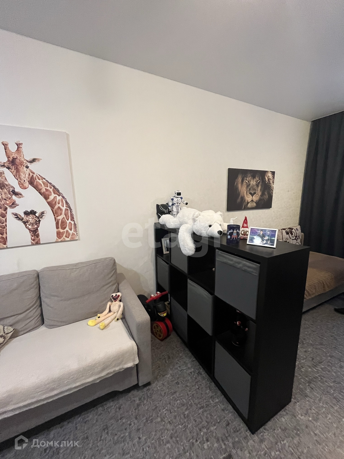 В детской комнате расположены два раскладывающихся дивана, два рабочих стола и стула, шкаф, комод, стеллаж, ночник.
