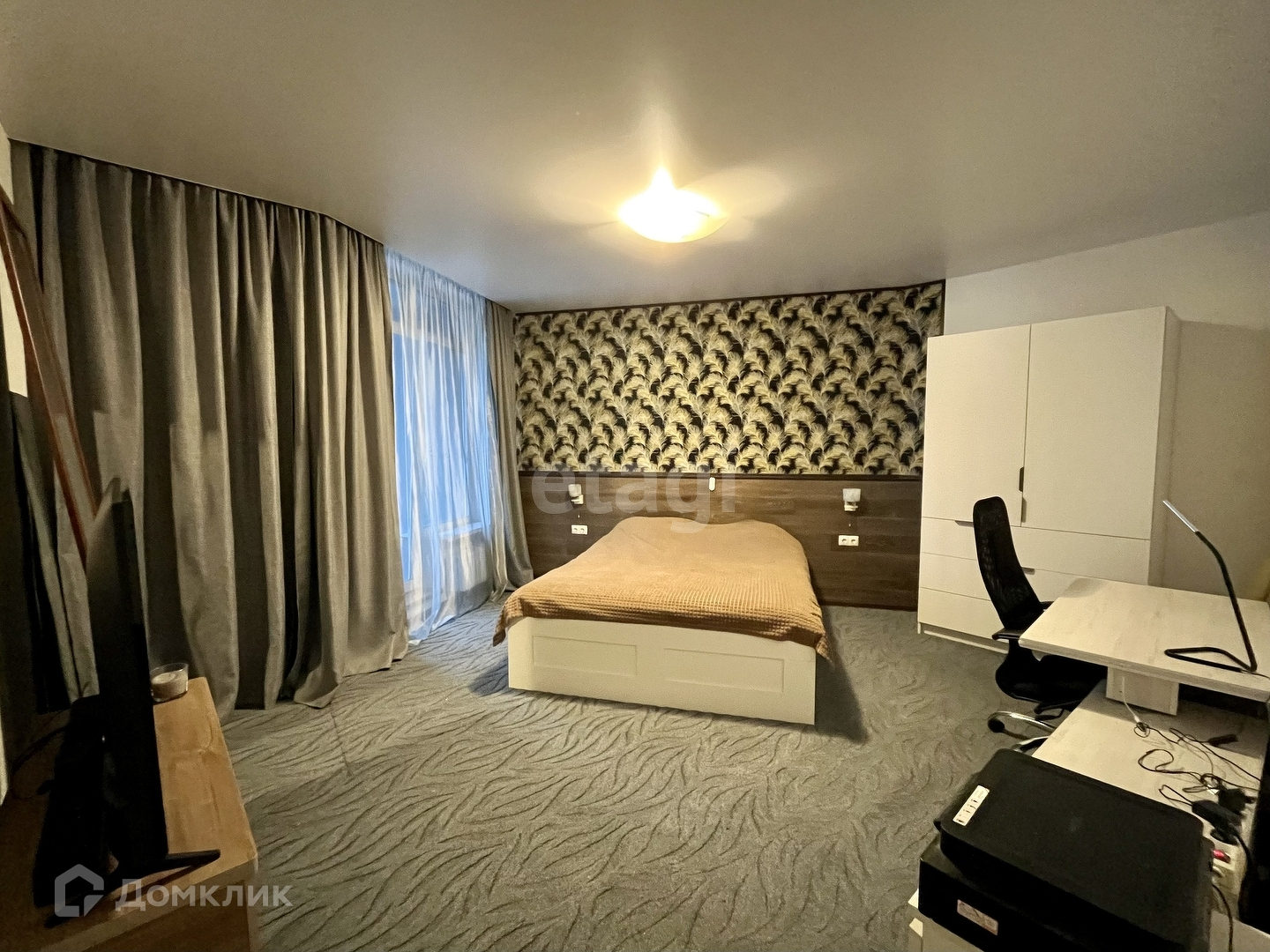 В спальне установлена удобная кровать и шкаф для хранения вещей. Отсюда также есть выход на лоджию с панорамным остеклением.