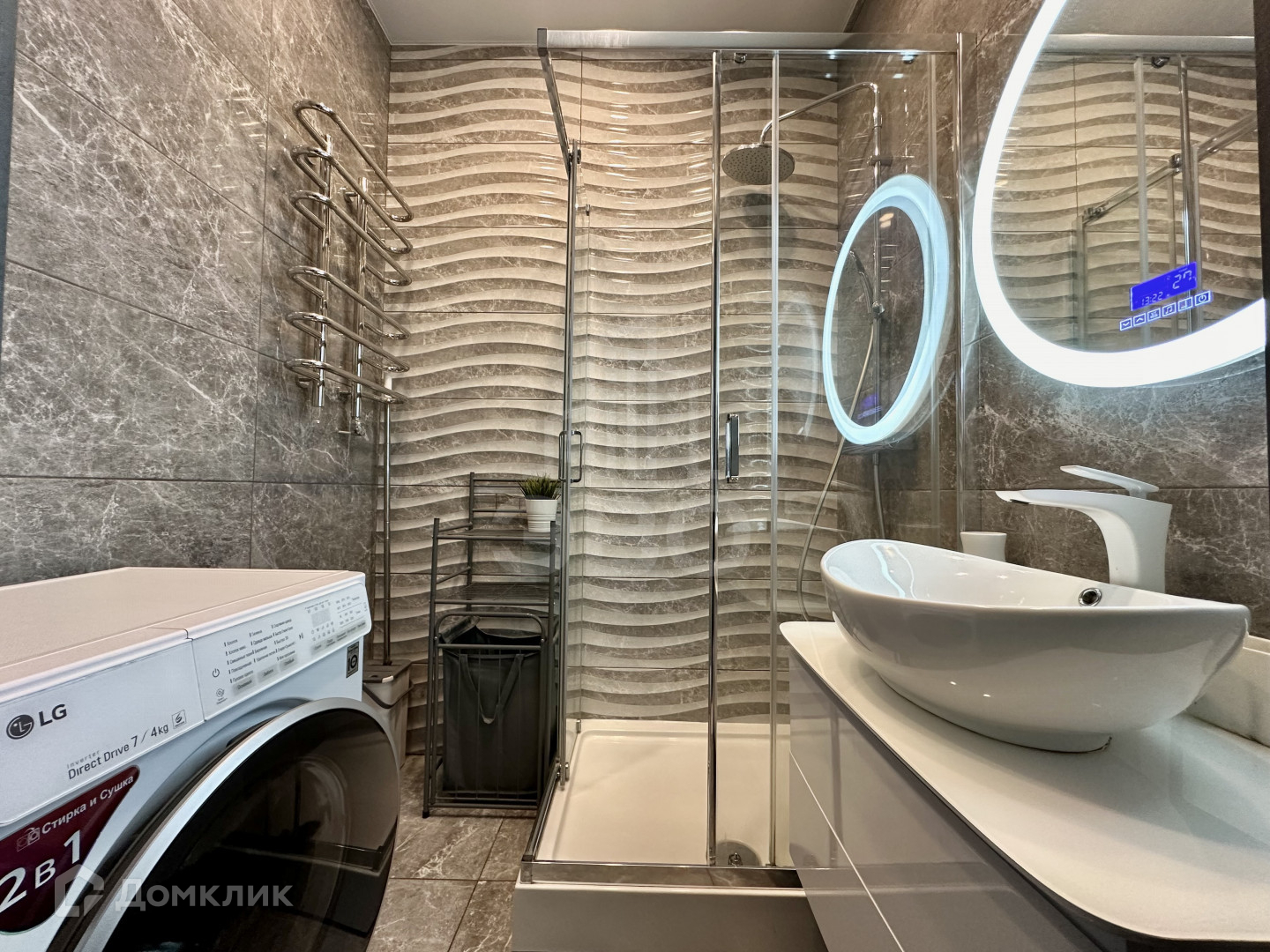 * Ванная зона: душ, туалет, раковина с шкафчиком, зеркало с подсветкой, полотенце-сушитель;