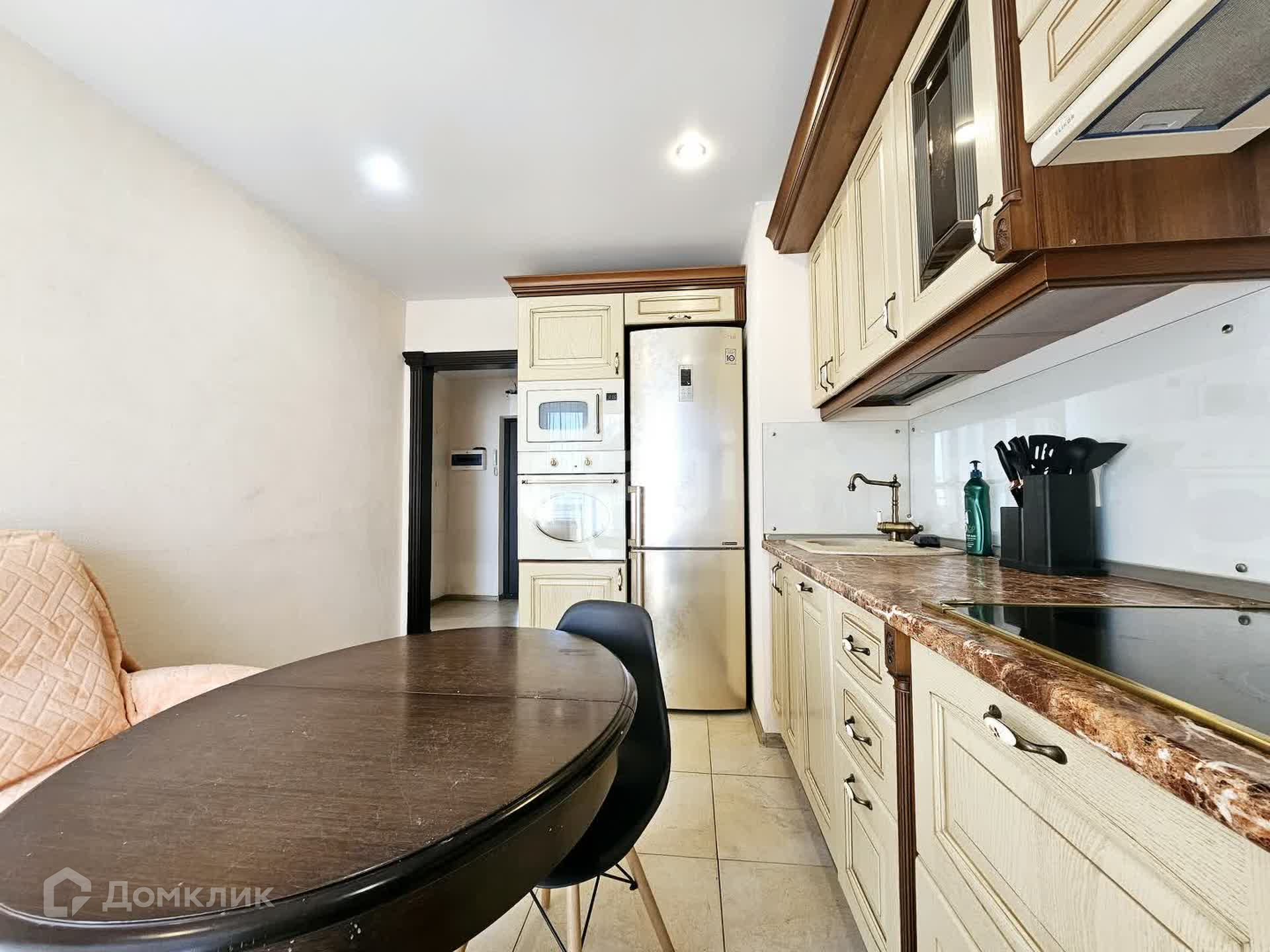 Кухня со всей необходимой посудой и техникой: холодильник, микроволновка, чайник, духовка
