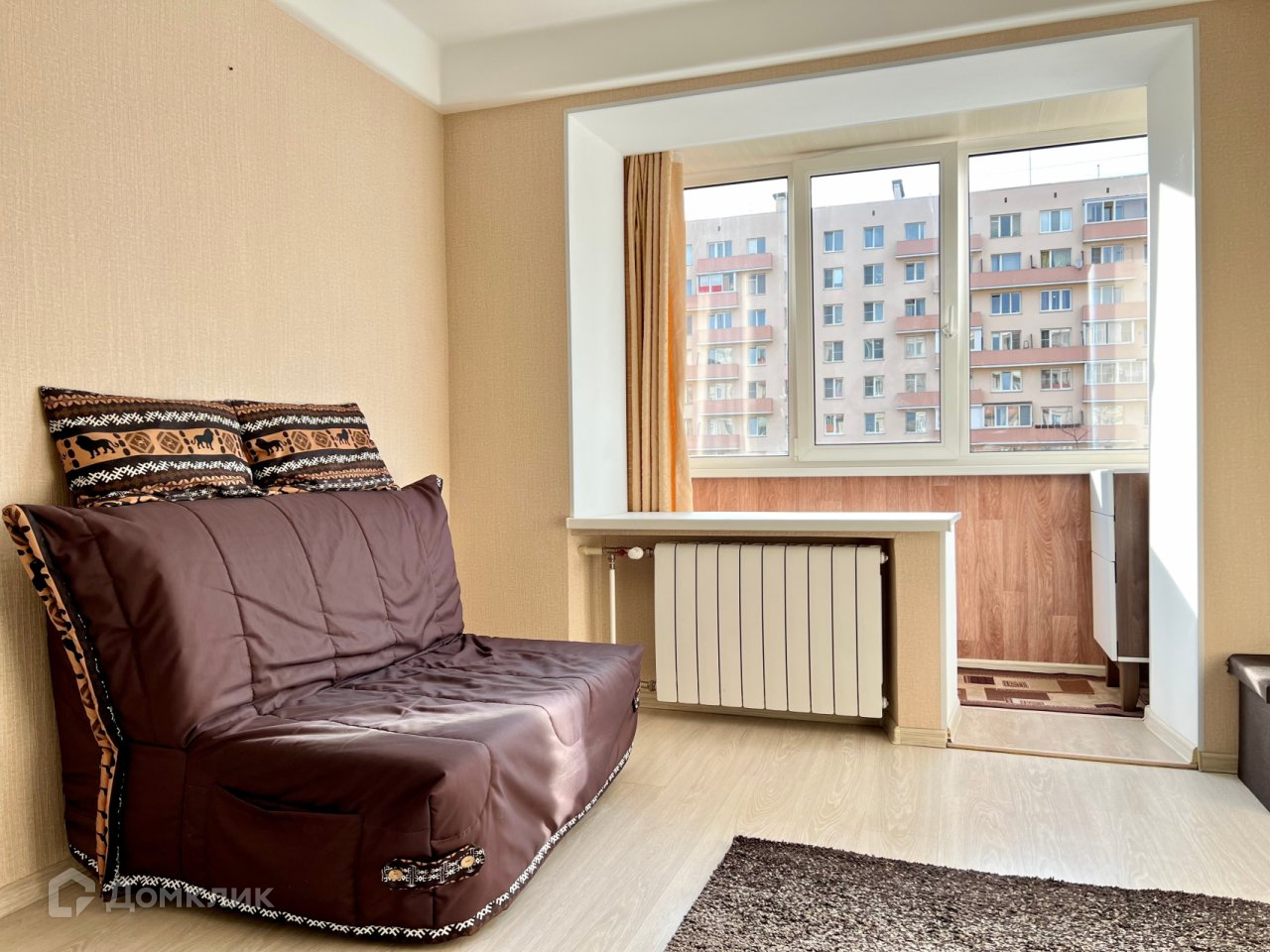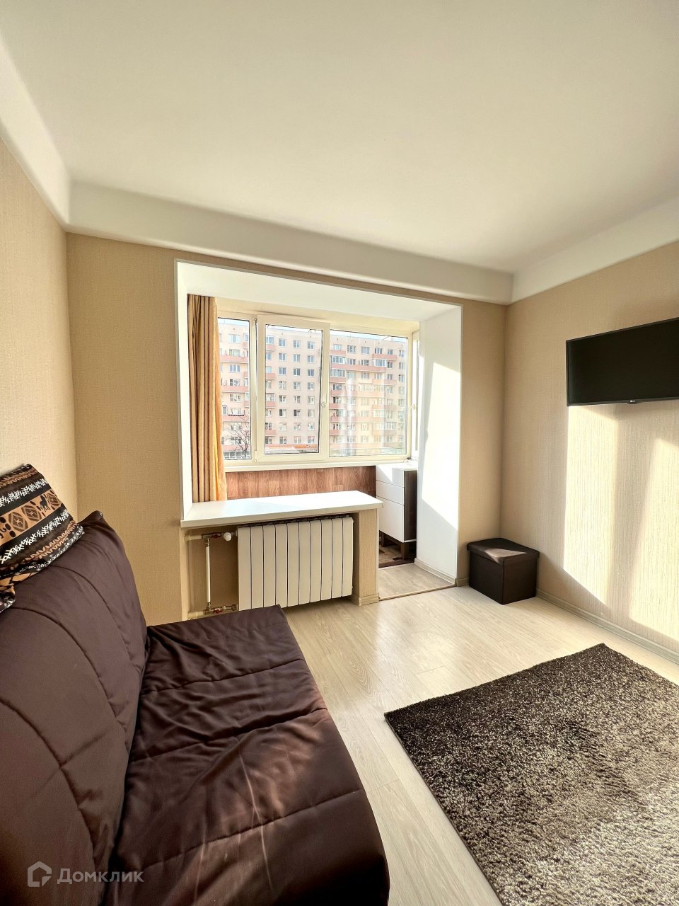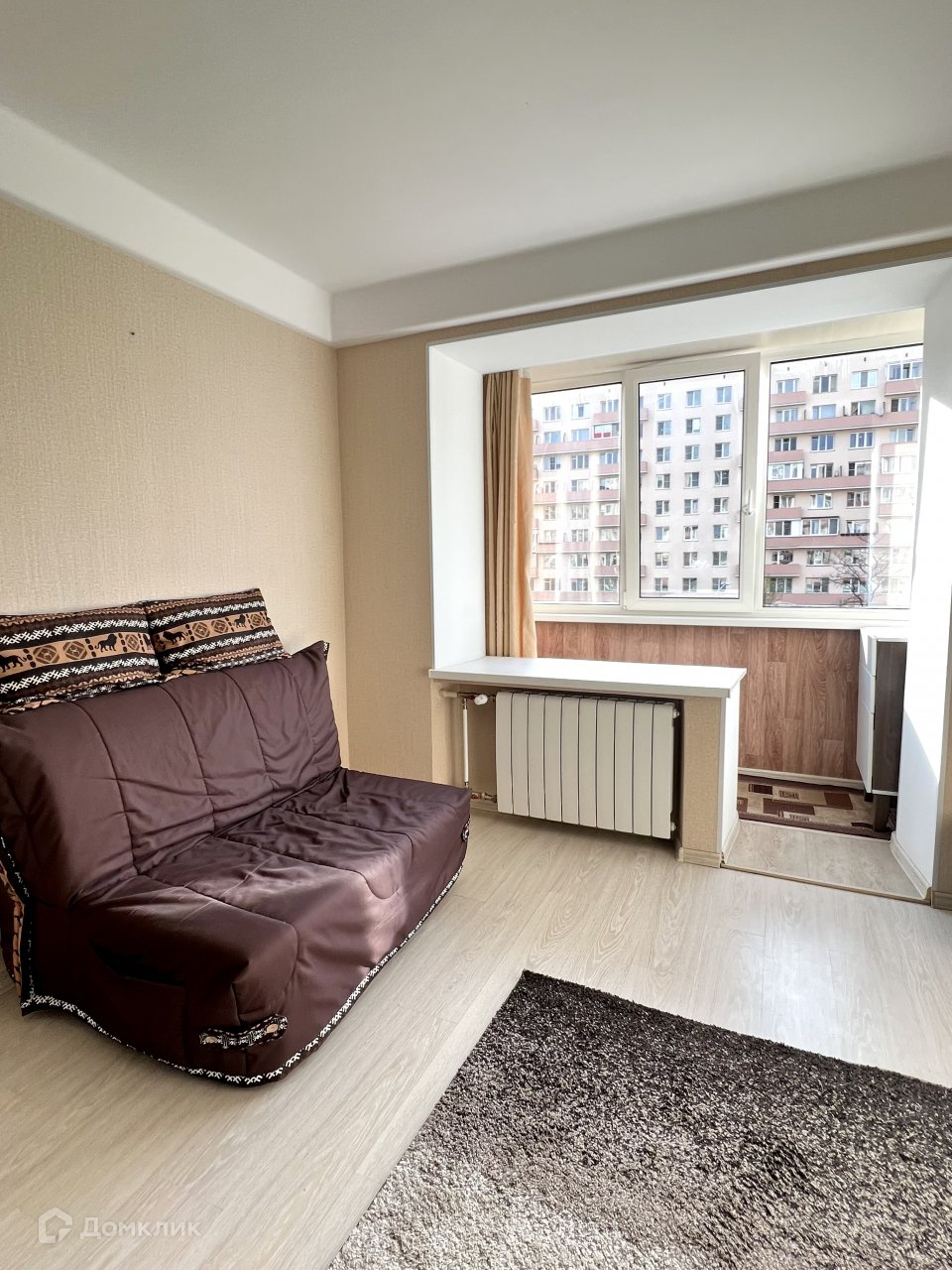 Квартира расположена на 3 этаже. Общая площадь- 34 кв. м. Комната 16 кв. м, кухня 9 кв.м. Есть большой застекленный балкон. Квартира очень светлая.