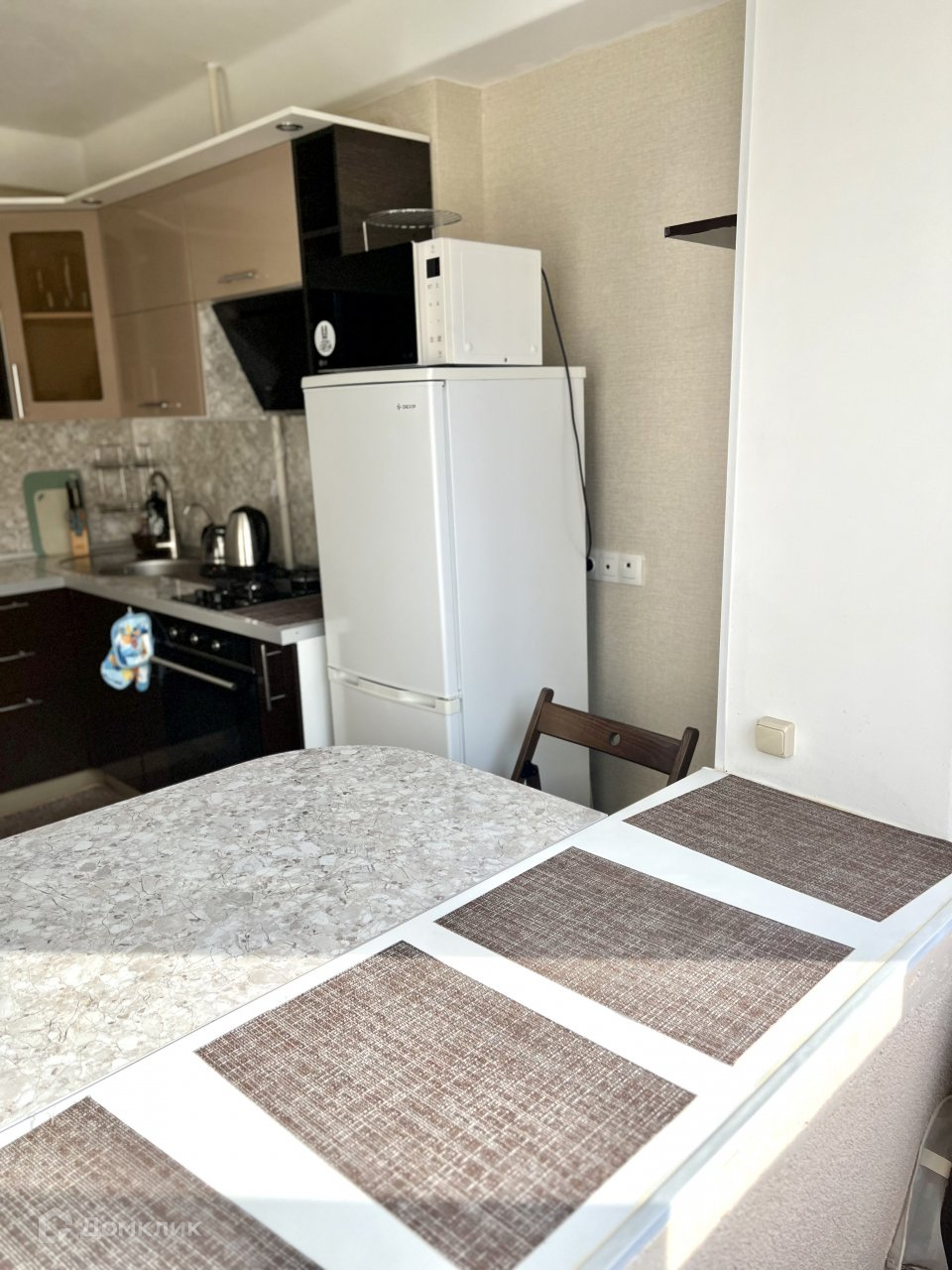 Квартира оборудована новой мебелью и техникой: кровать с хорошим матрасом, диван, стол со стульями, встроенная кухонная мебель с техникой: варочная поверхность, вытяжка, духовка, холодильник, стиральная машина в санузле, вместительный шкаф в прихожей, телевизор