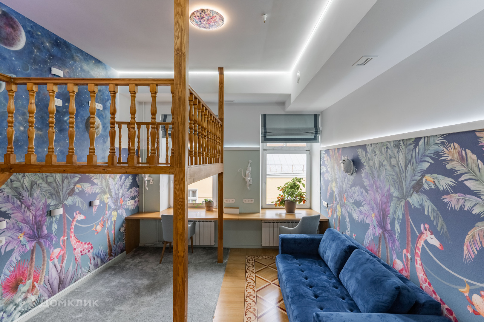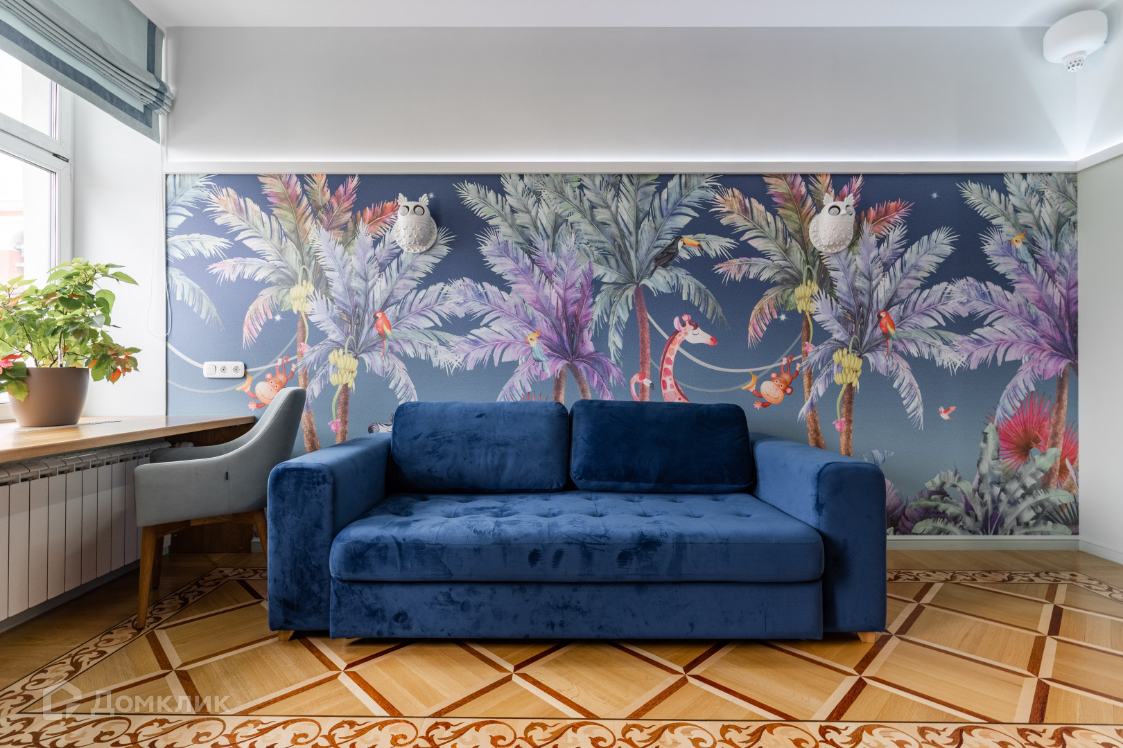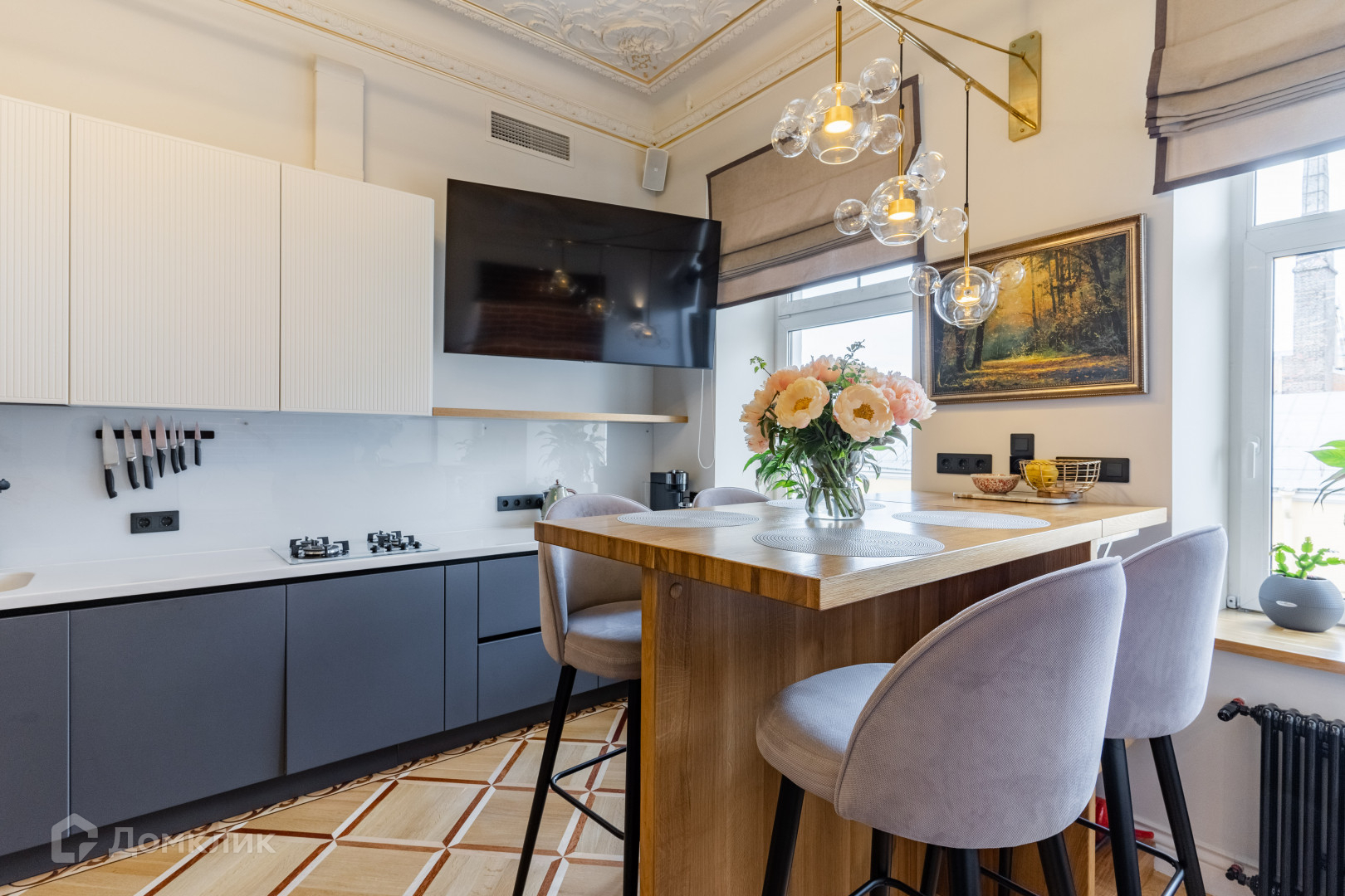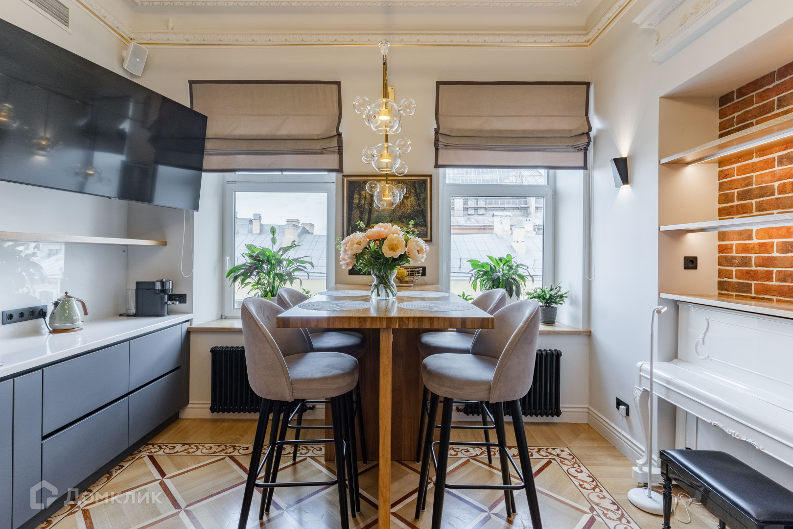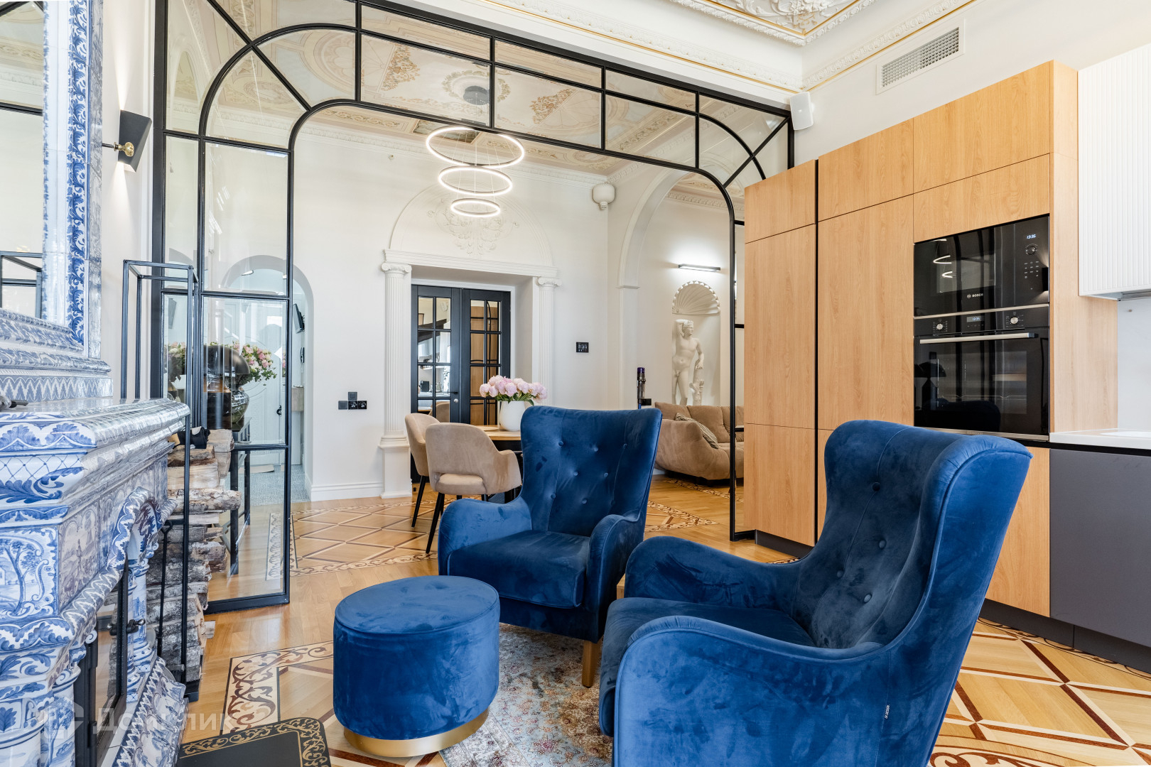 покрытия был выбран наборный паркет, чтобы подчеркнуть роскошь и элегантность