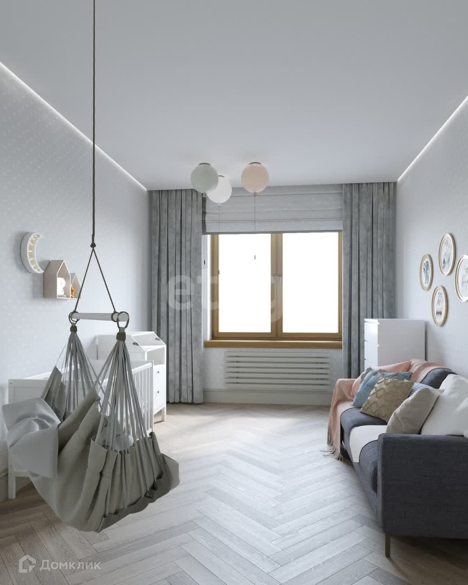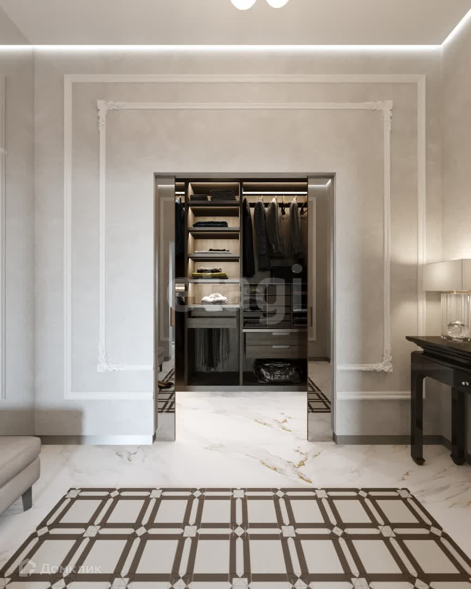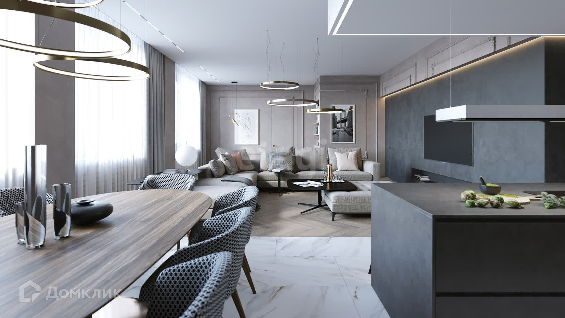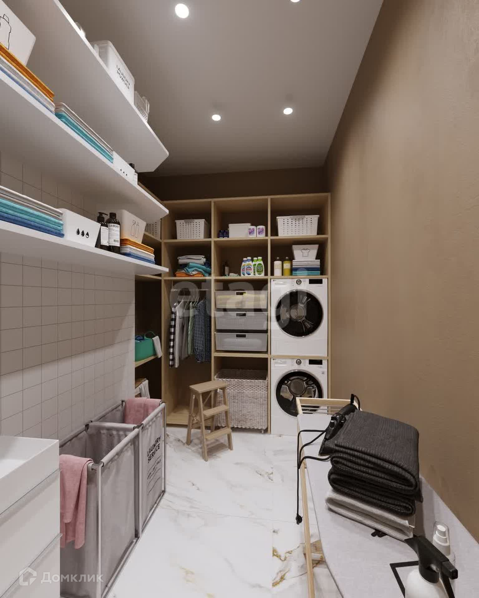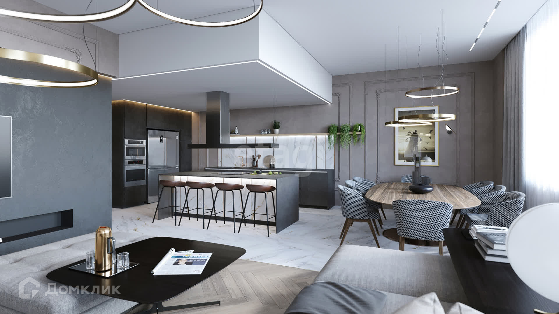 Планировка: 3 спальни (мастер-спальня, детская, игровая), кухня-столовая совмещена с гостиной, кабинет, 3 санузла, 2 гардеробные и постирочная.