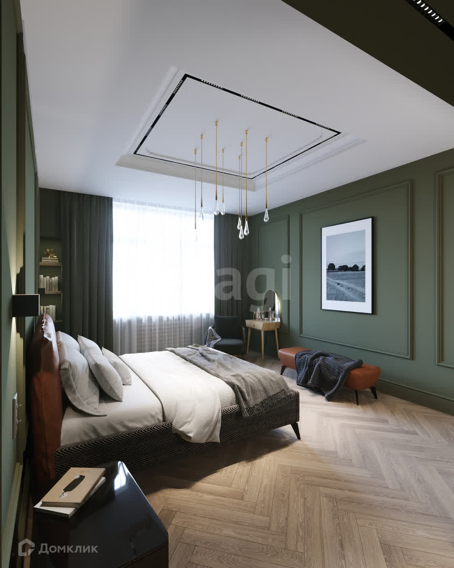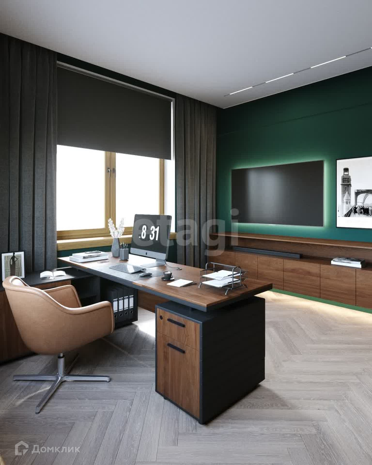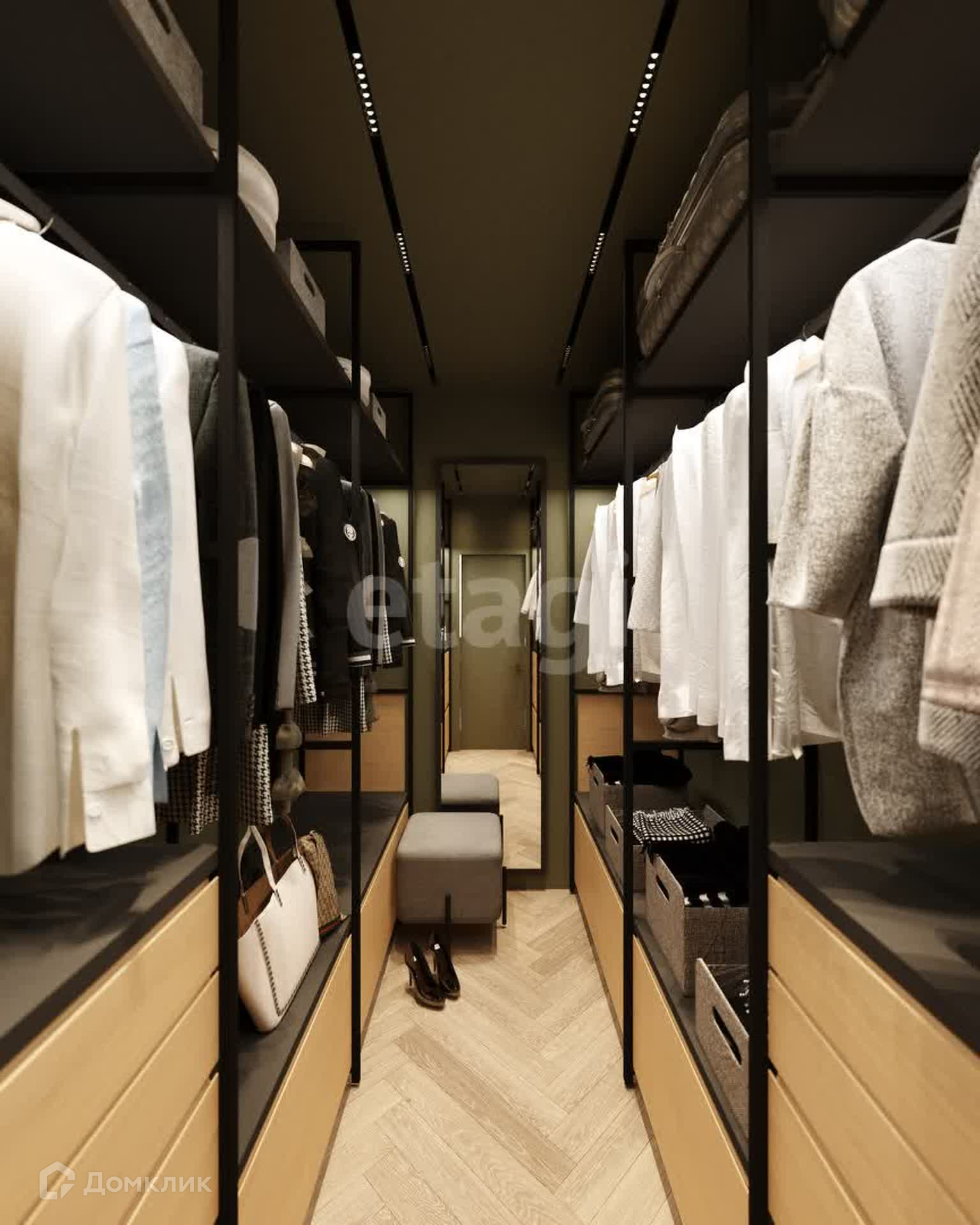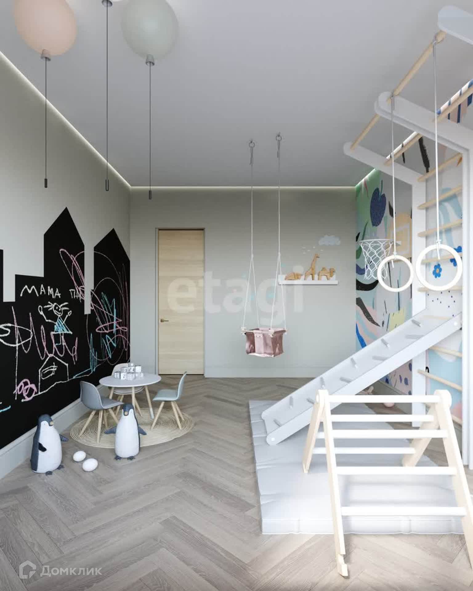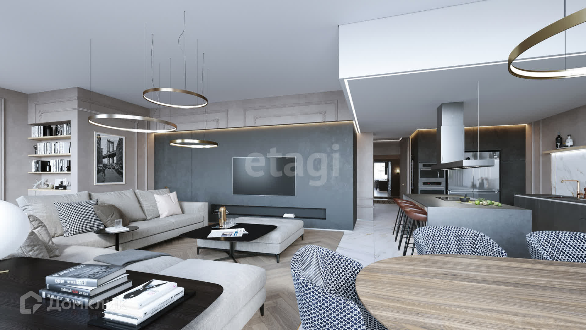 Планировка: 3 спальни (мастер-спальня, детская, игровая), кухня-столовая совмещена с гостиной, кабинет, 3 санузла, 2 гардеробные и постирочная.