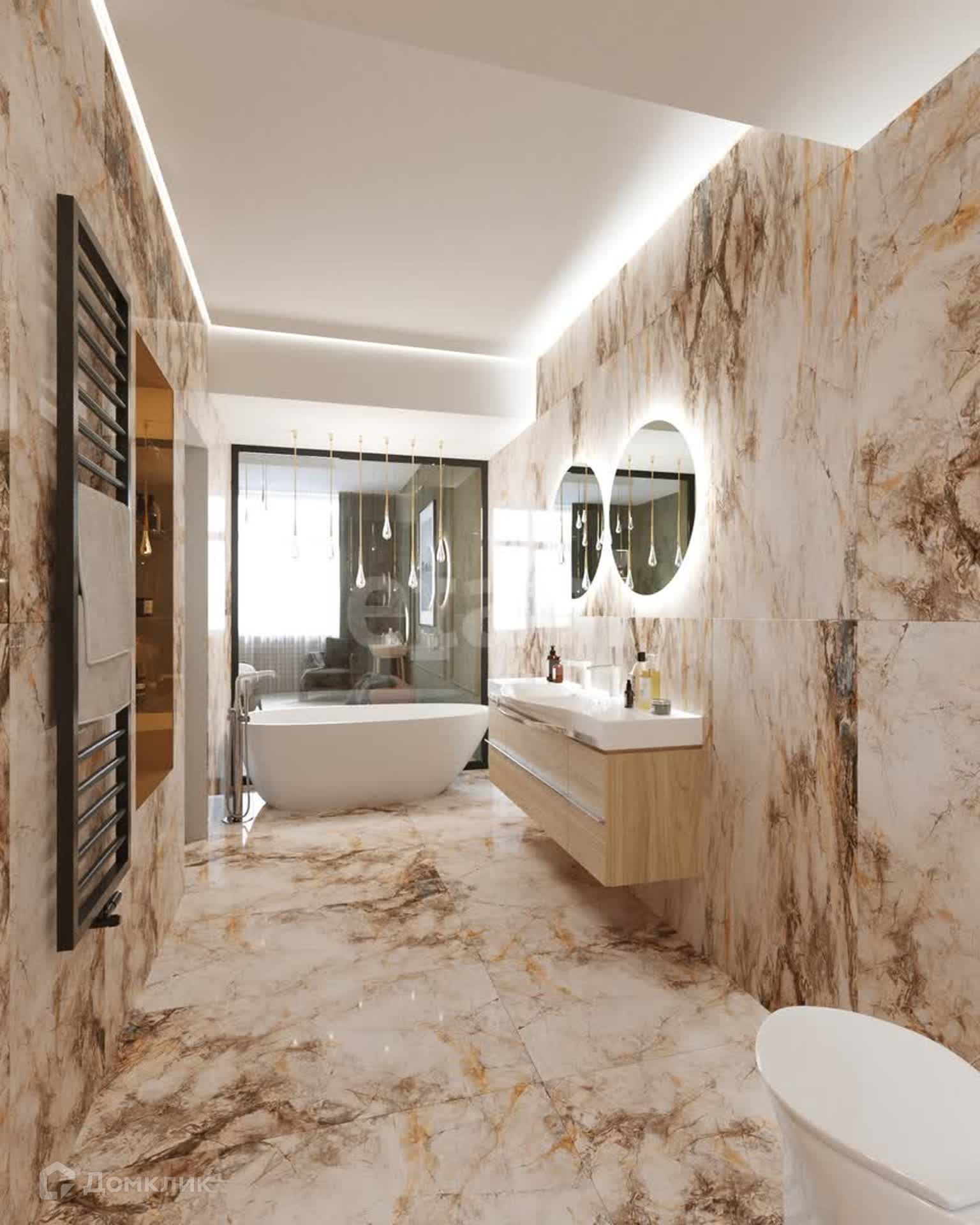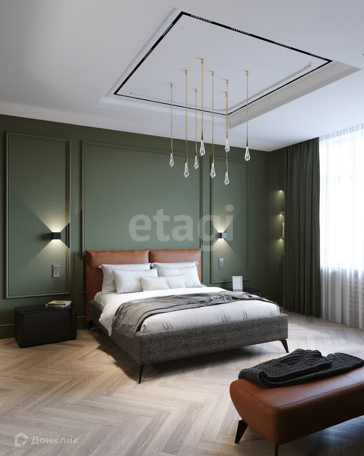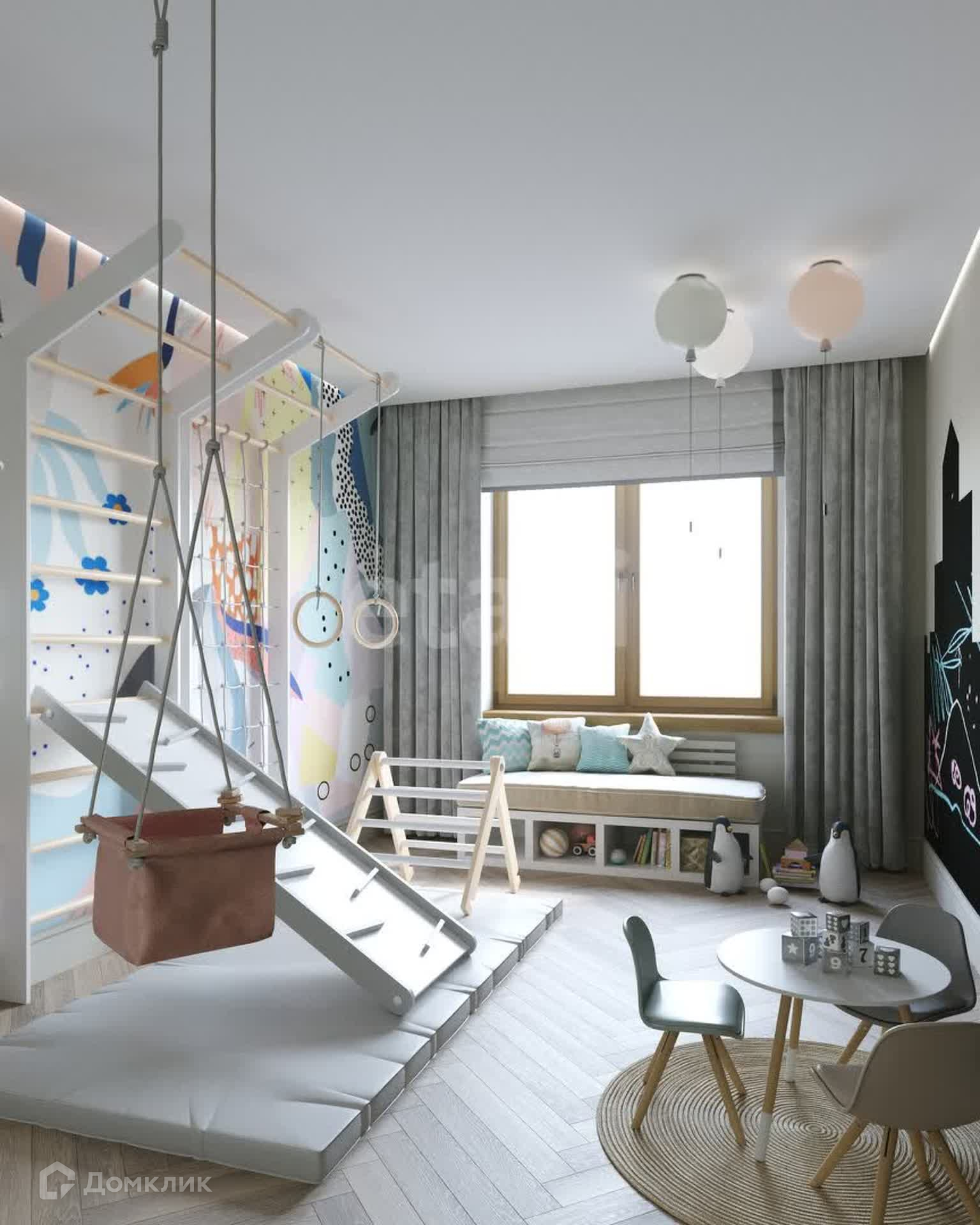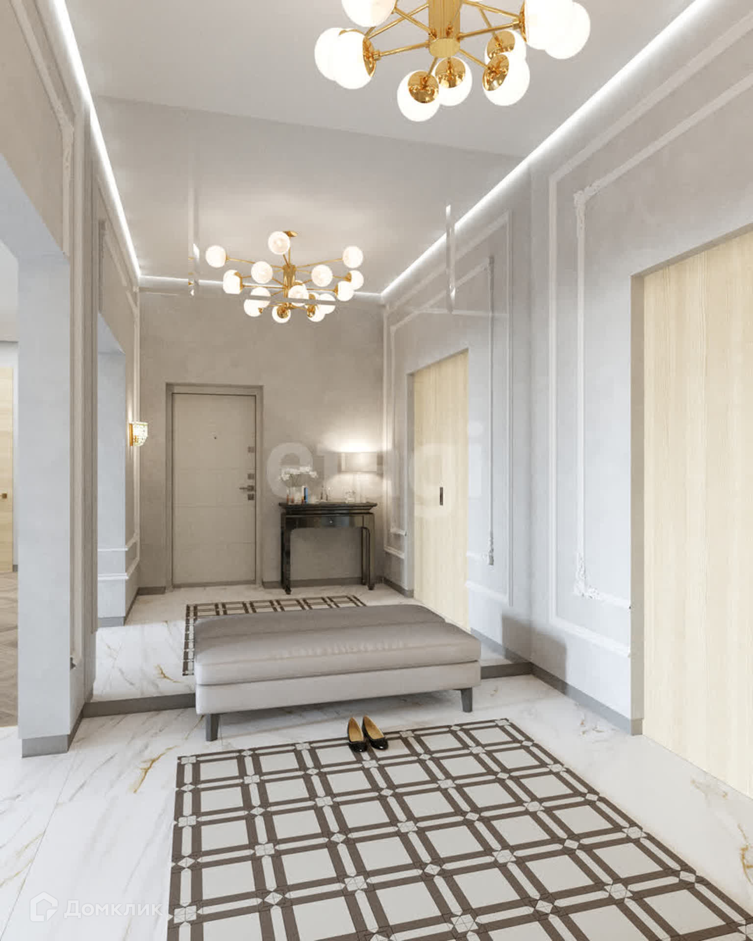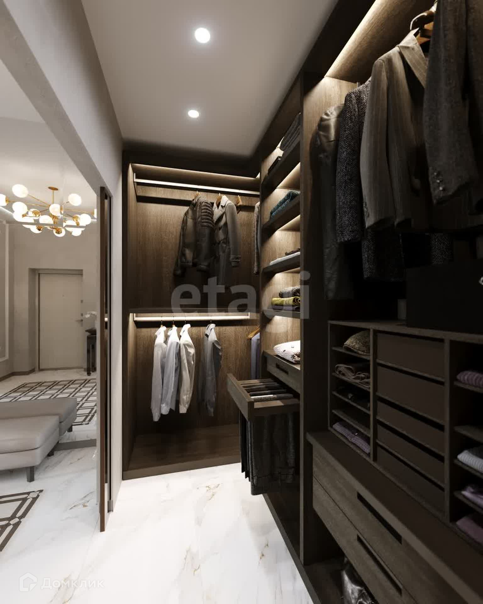 Планировка: 3 спальни (мастер-спальня, детская, игровая), кухня-столовая совмещена с гостиной, кабинет, 3 санузла, 2 гардеробные и постирочная.