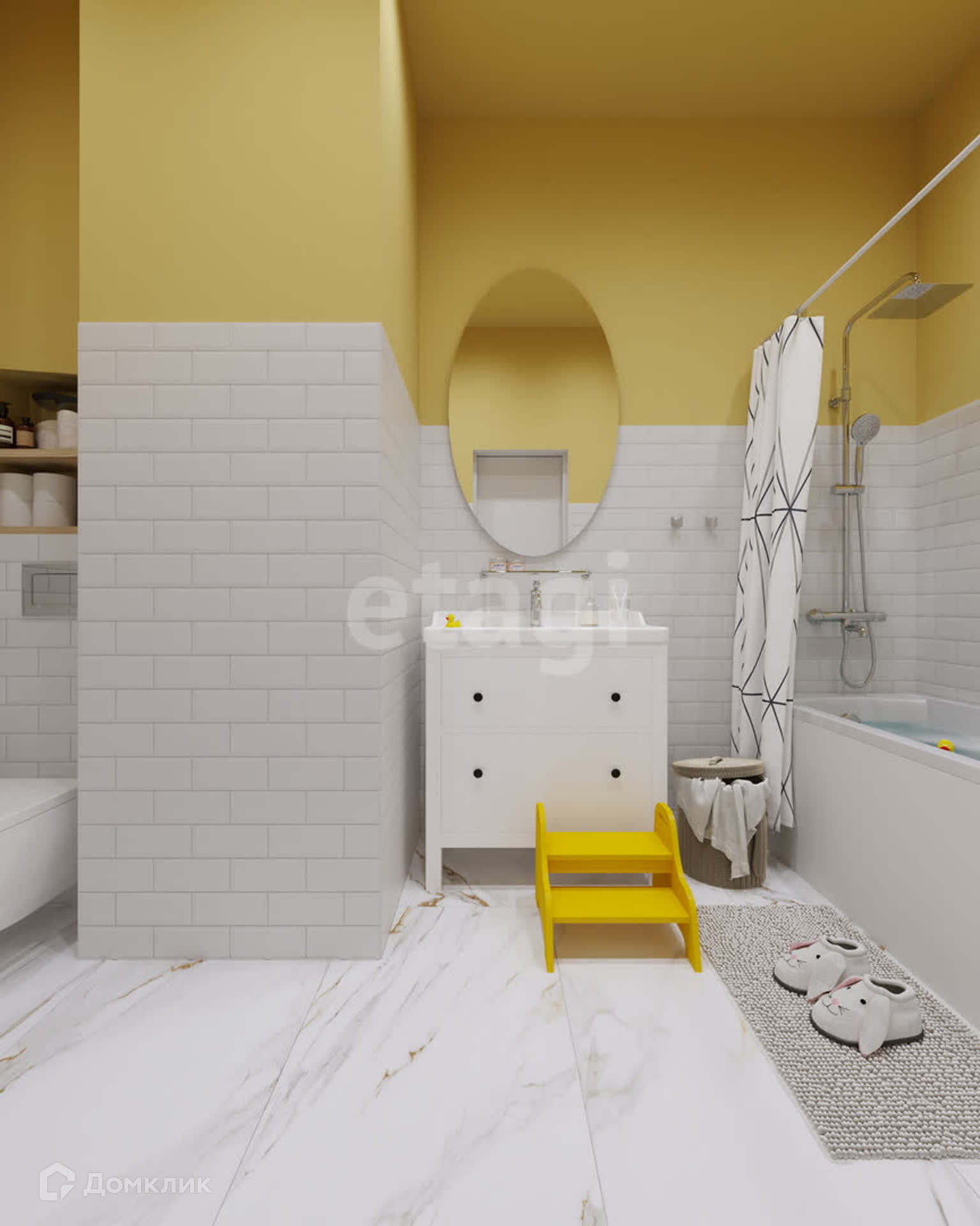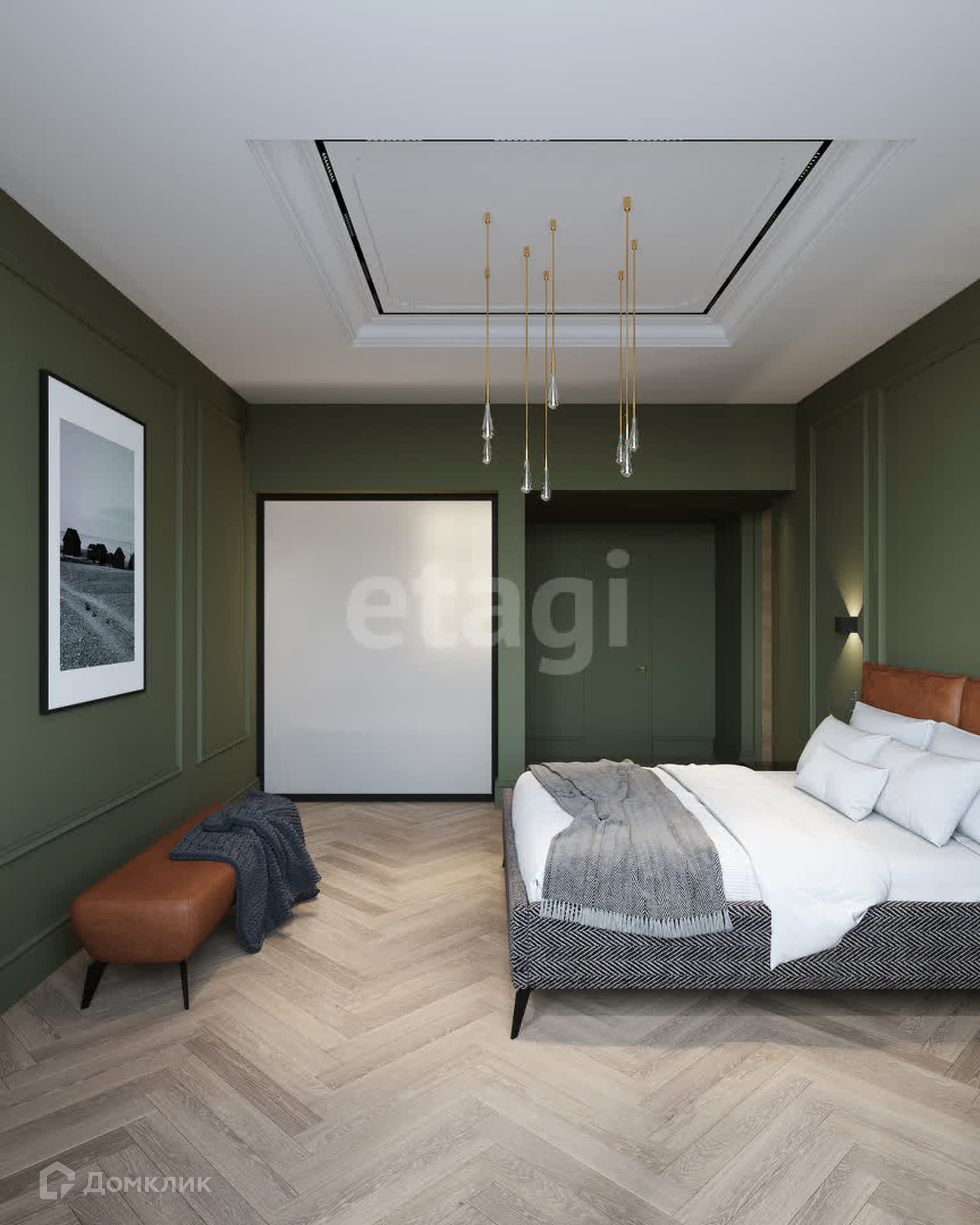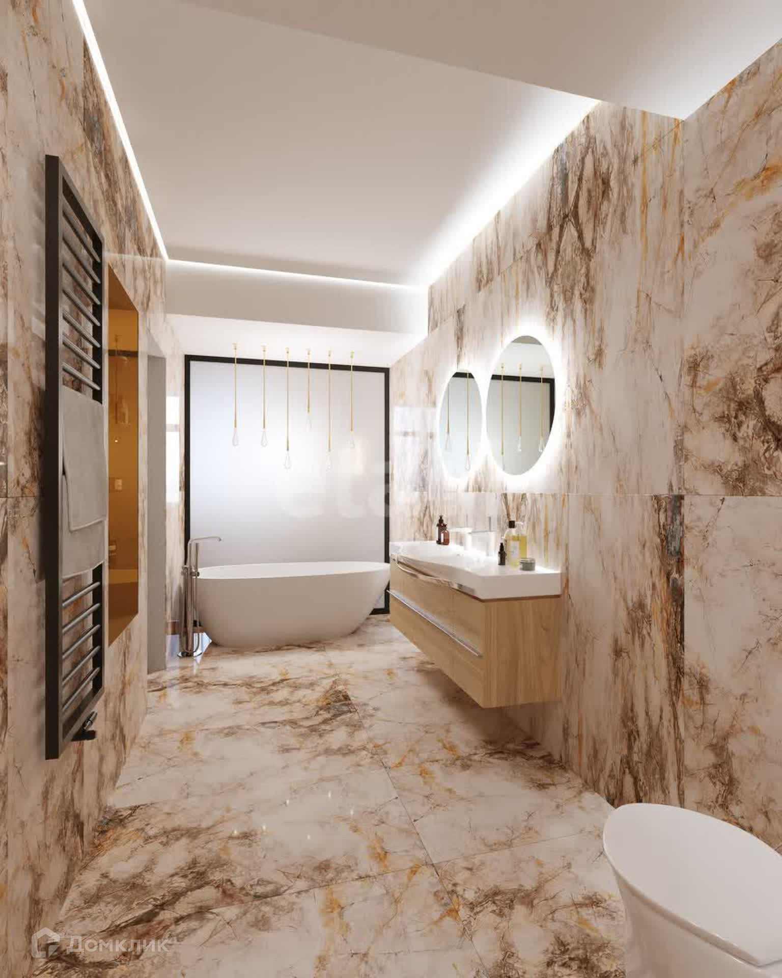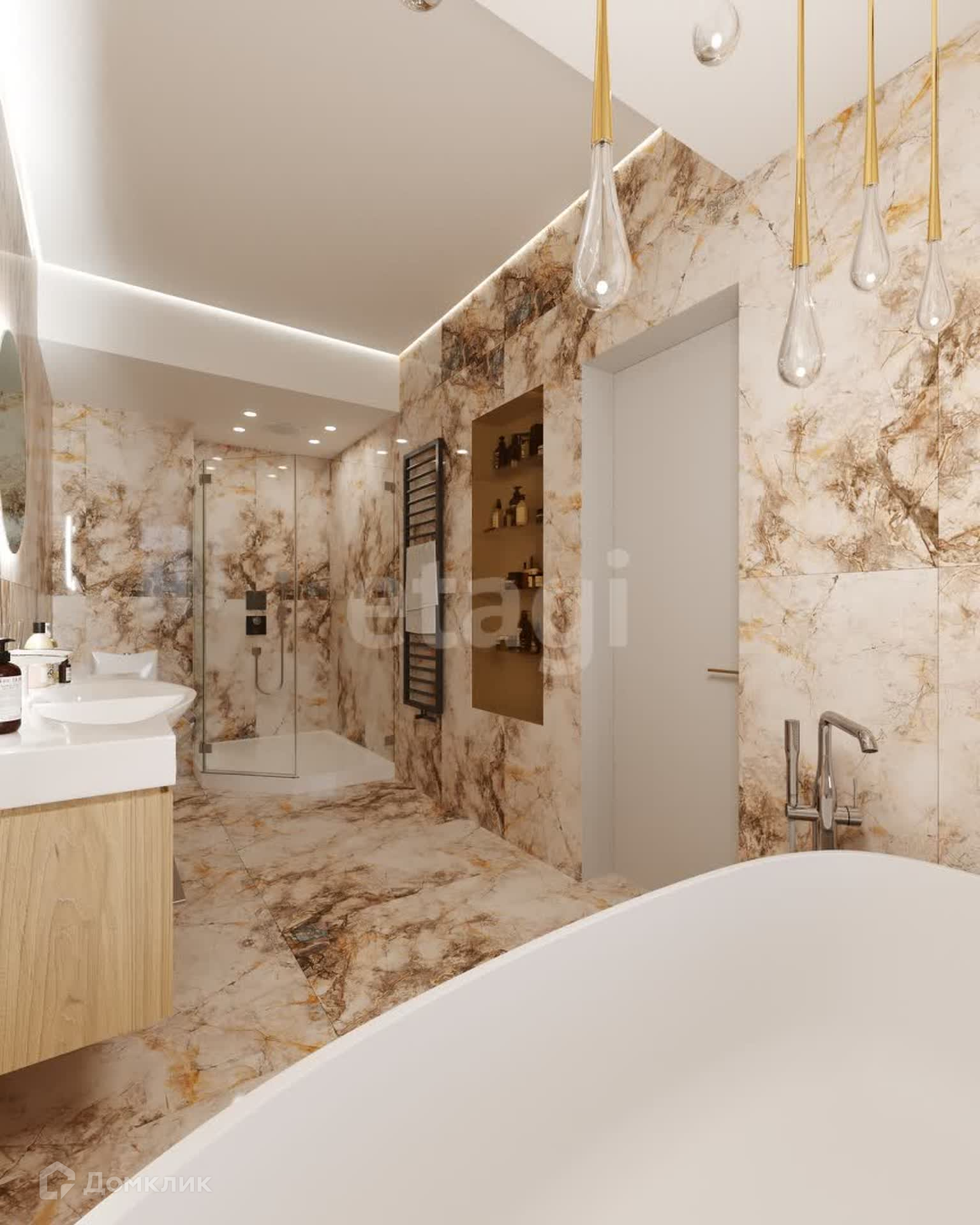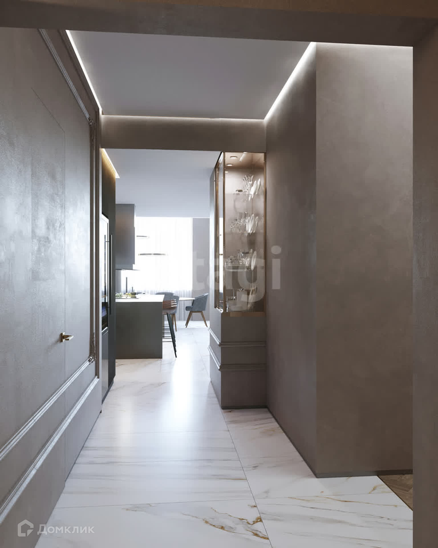 Планировка: 3 спальни (мастер-спальня, детская, игровая), кухня-столовая совмещена с гостиной, кабинет, 3 санузла, 2 гардеробные и постирочная.