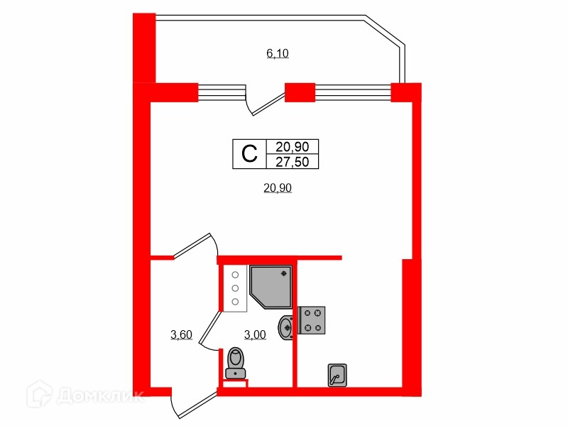 Общая площадь 27.5 м2