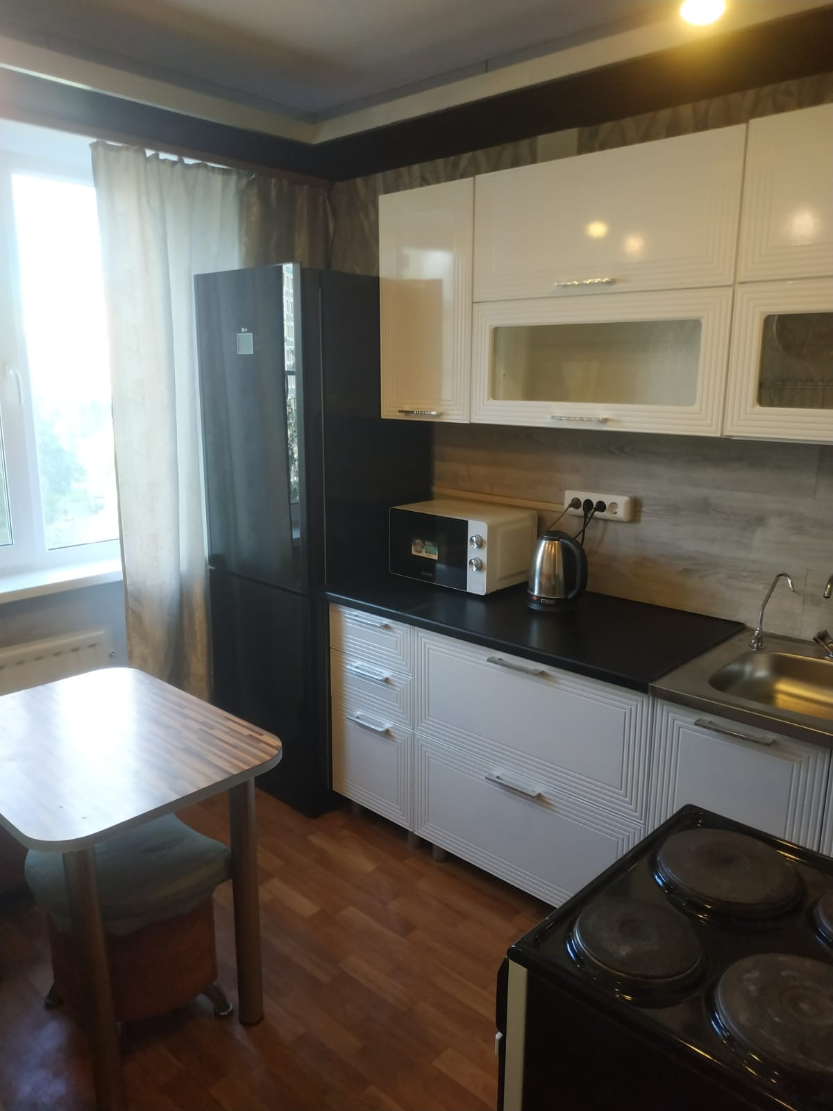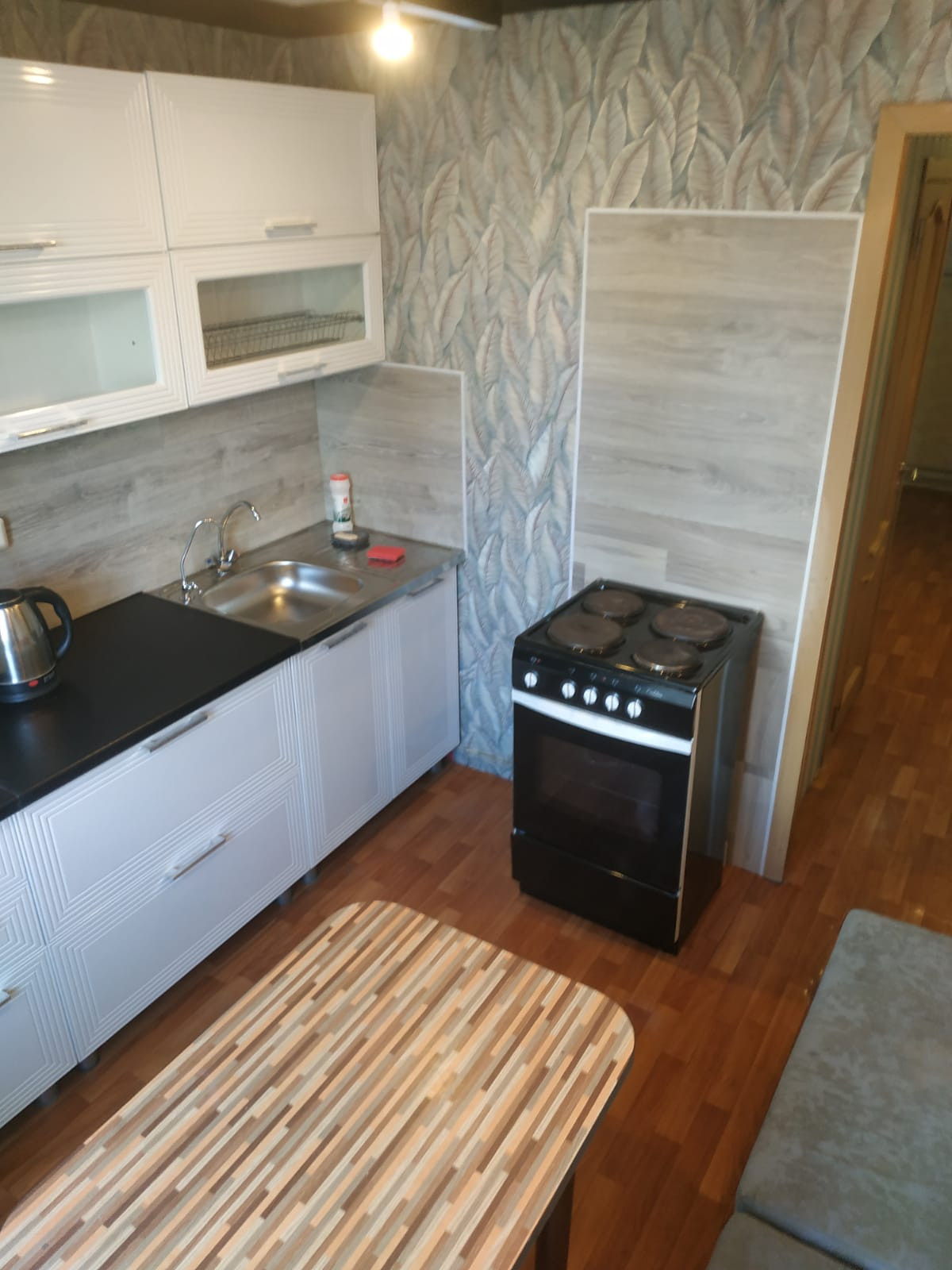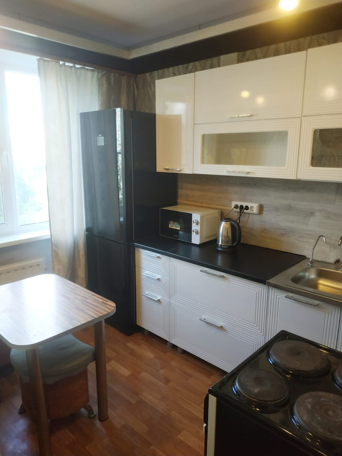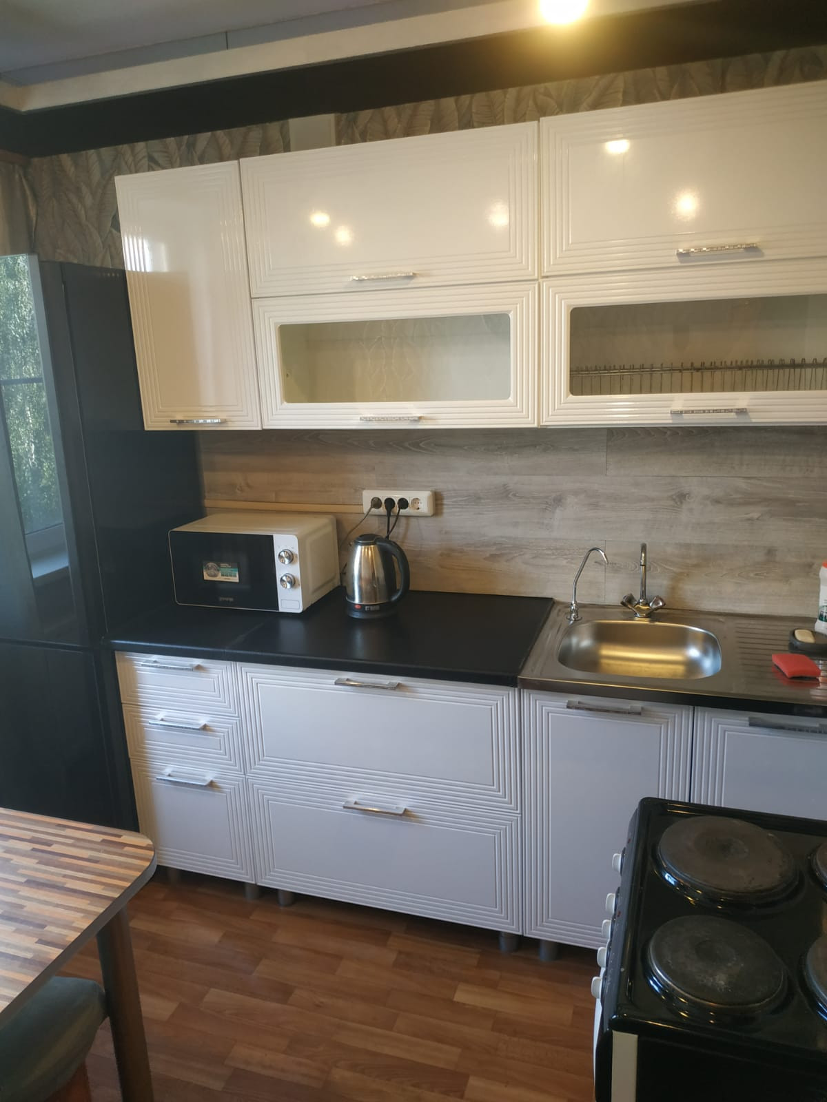 На просторной кухне новый кухонный гарнитур  с эл чайником , СВЧ  и некоторой посудой. Можно  с послушной кошечкой.  Только для славян, желательно  не более 2х человек.