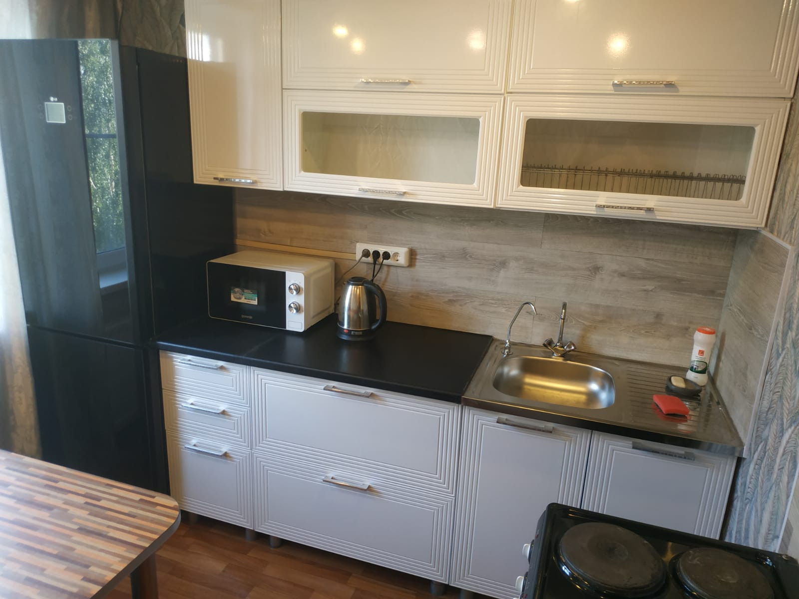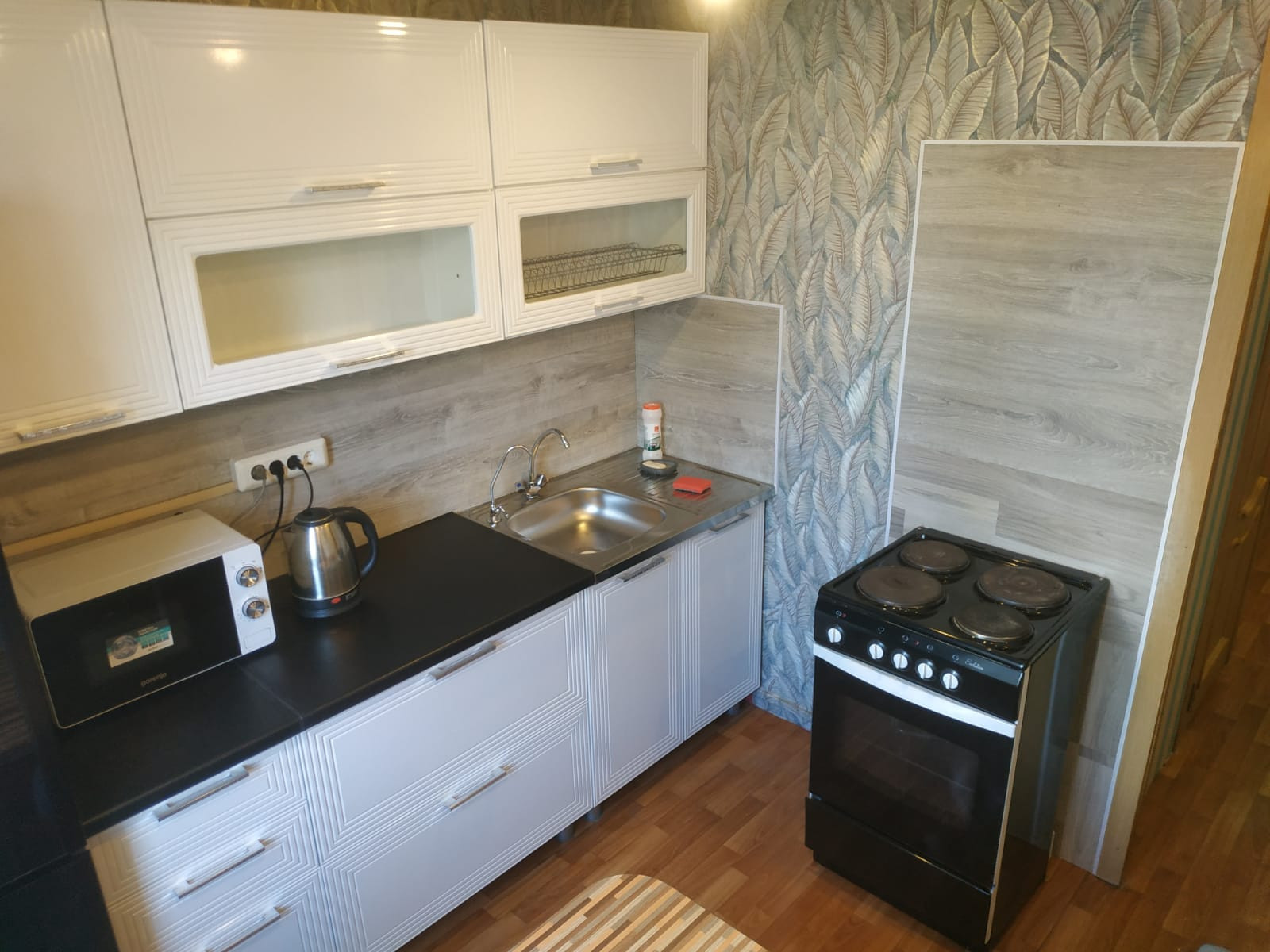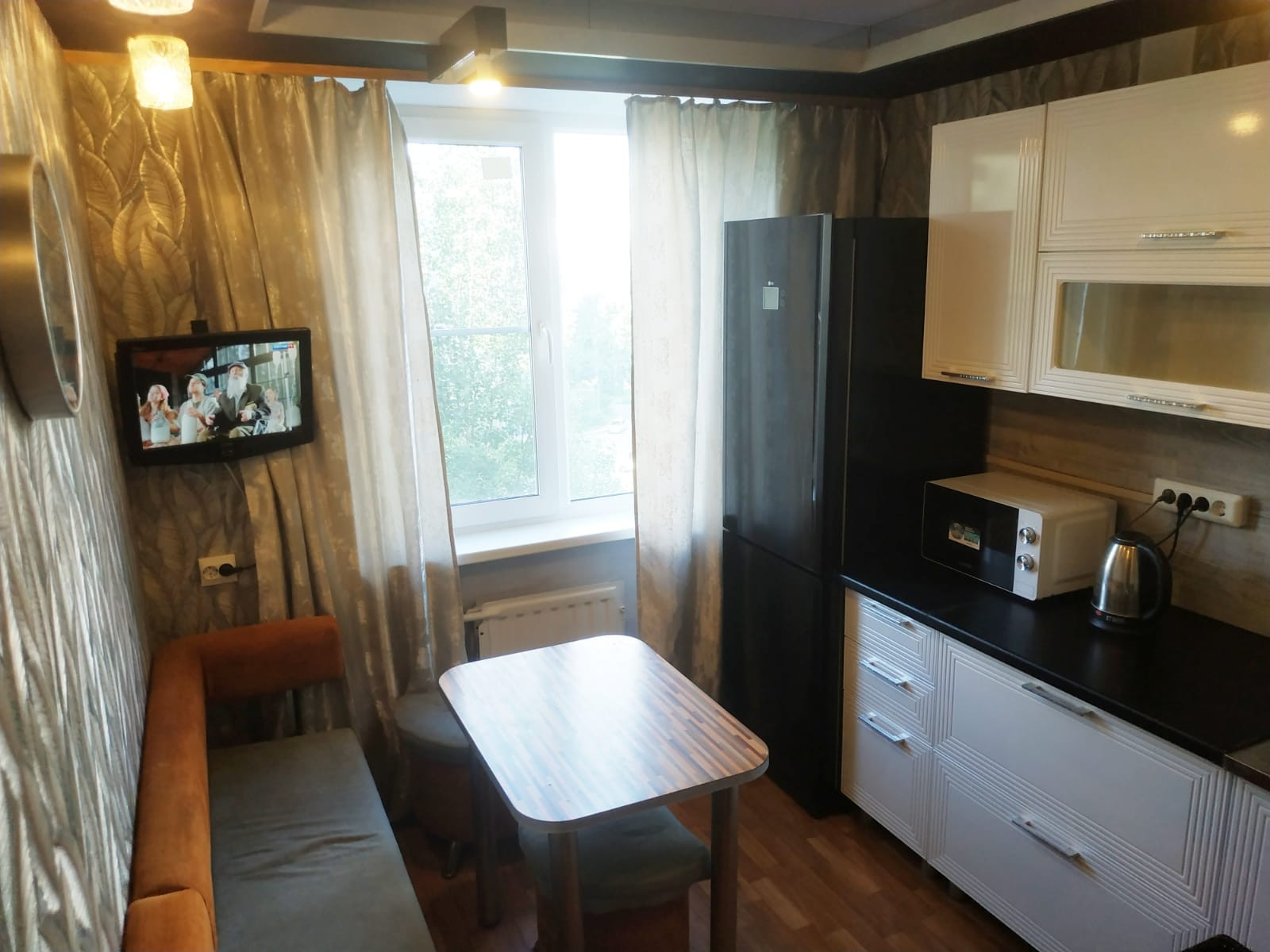 На просторной кухне новый кухонный гарнитур  с эл чайником , СВЧ  и некоторой посудой. Можно  с послушной кошечкой.  Только для славян, желательно  не более 2х человек.