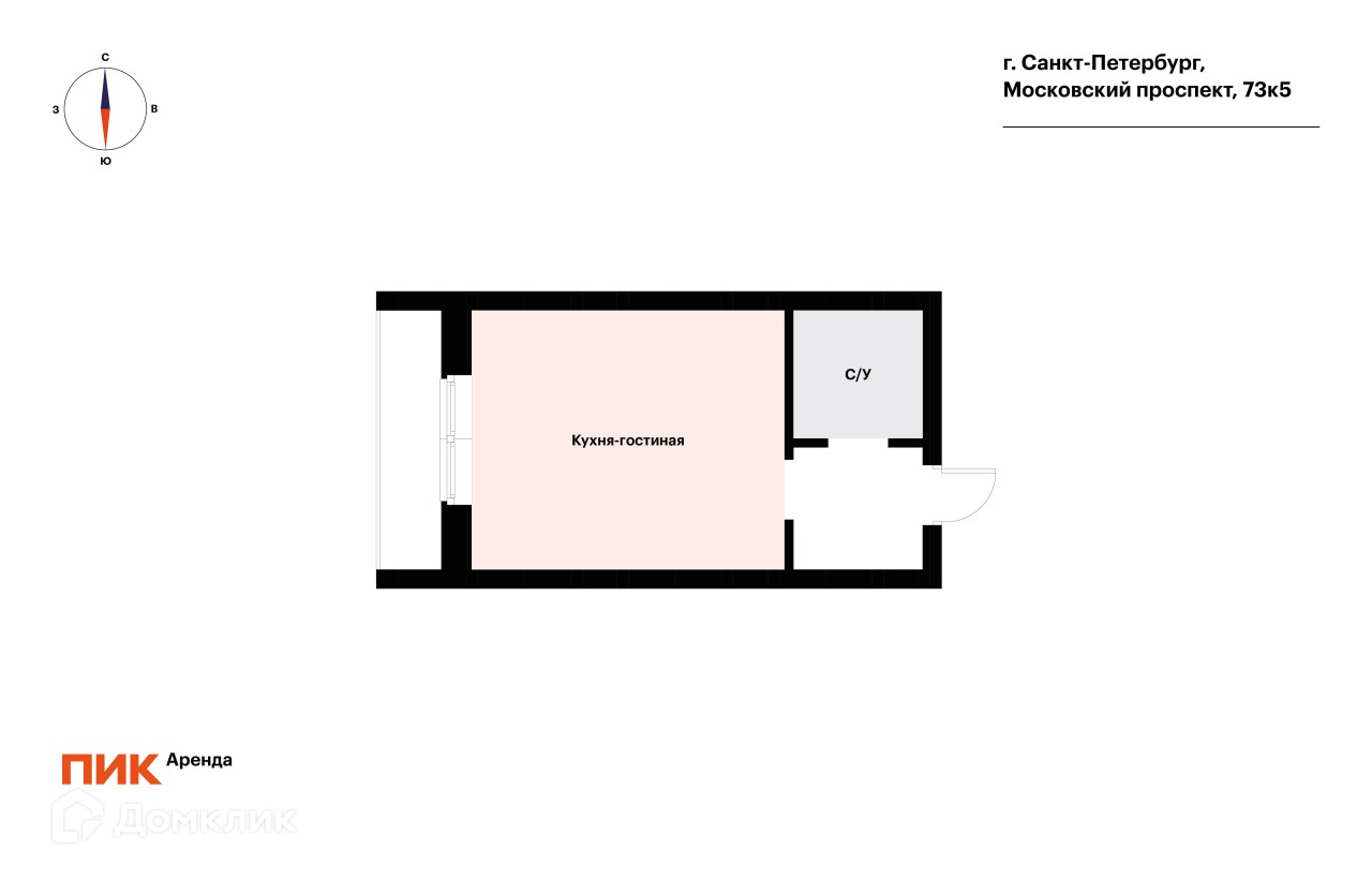 Квартира студия, 25 м2, в аренду на длительный срок в Санкт-Петербурге, Московский проспект, 73к5