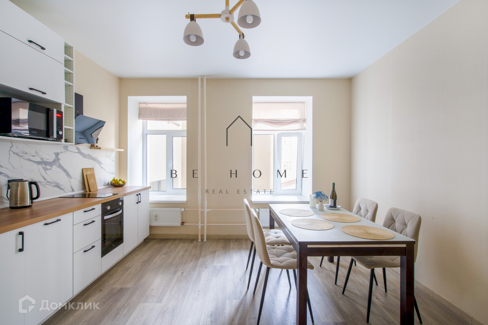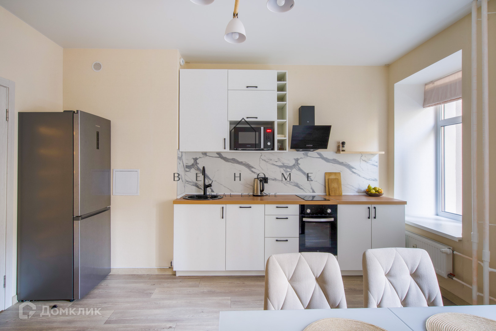 Просторная кухня с обеденной зоной, большая спальня с выделенным рабочим местом, совмещенная ванная комната.