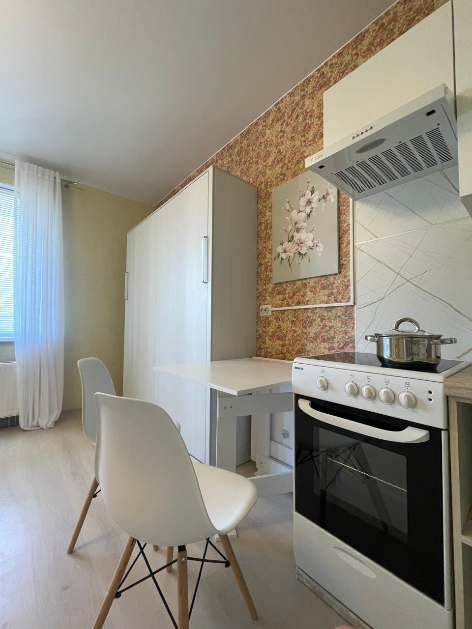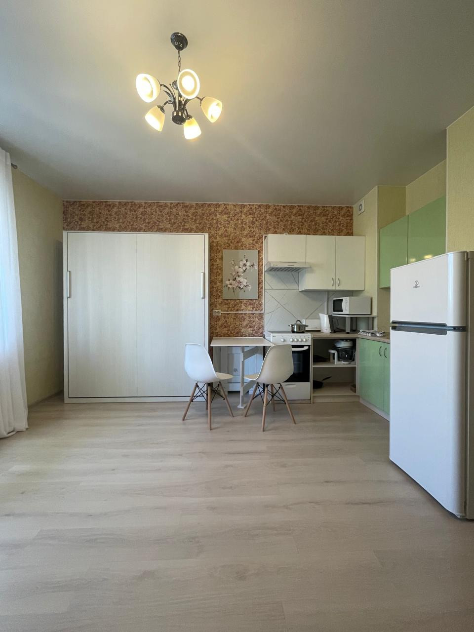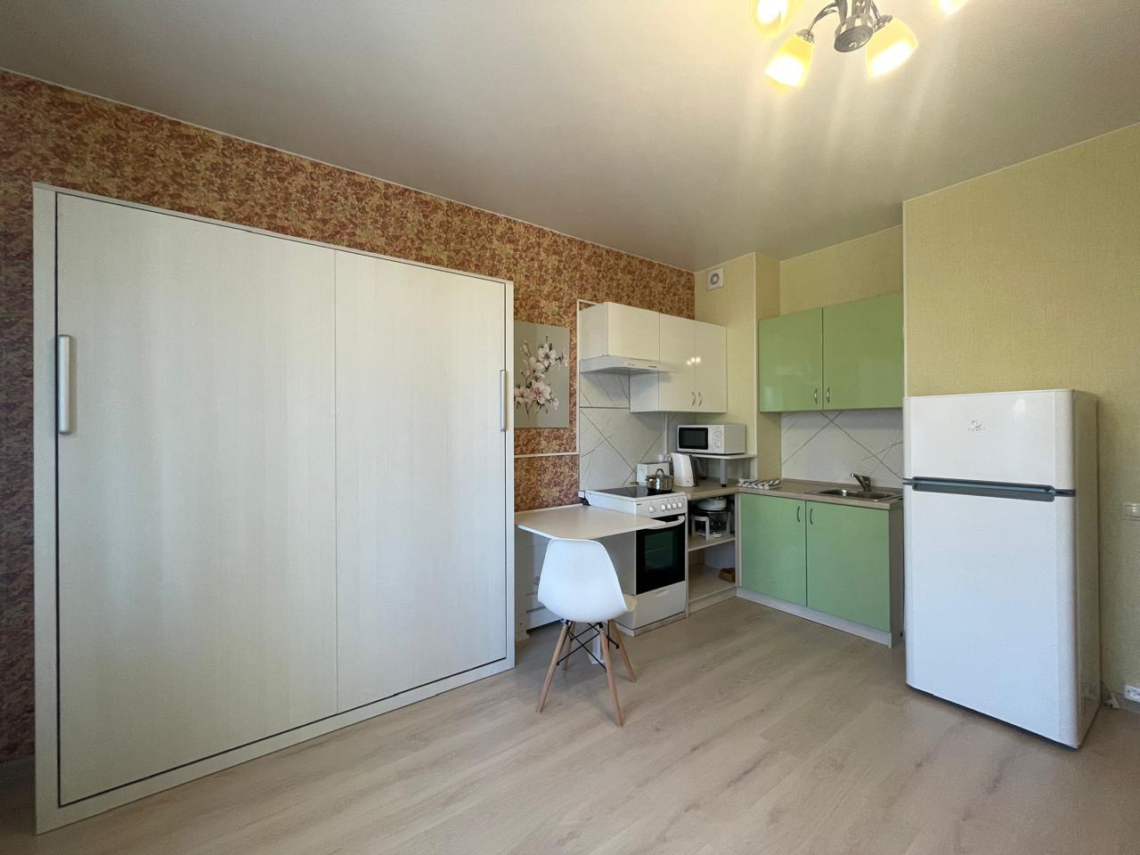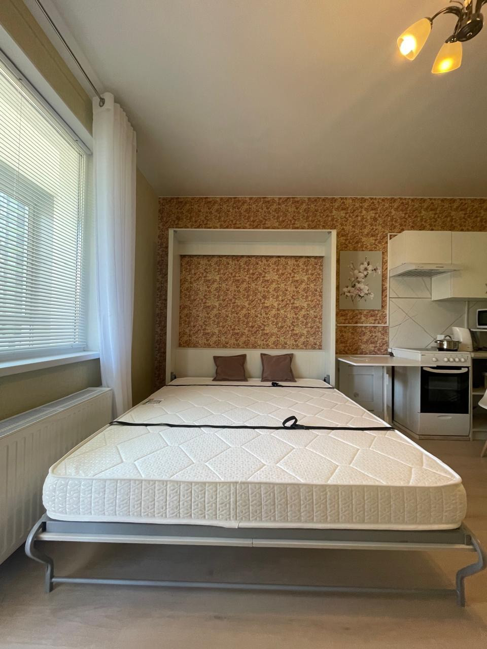 Качественный ремонт, хорошее состояние. Квартира оборудована мебелью, имеет всё для комфортного  проживания: стиральная машина, холодильник, переносной кондиционер. , плита с духовкой, микроволновая печь. Установлена новая кровать , ортопедический матрас имеет функцию памяти тела., оборудована подъемным механизмом. Компактно складывается и легко трансформируется в шкаф. В связи с этим в комнате всегда много свободного места .