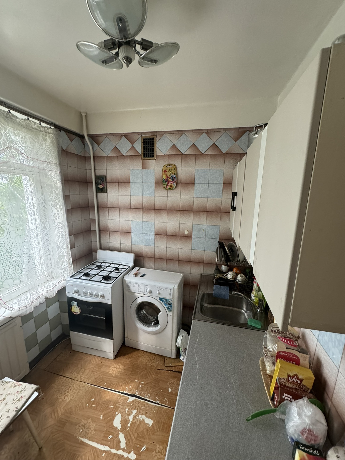 Кухня: холодильник, плита с 4 конфорками, духовка, электрический чайник, небольшой набор посуды.