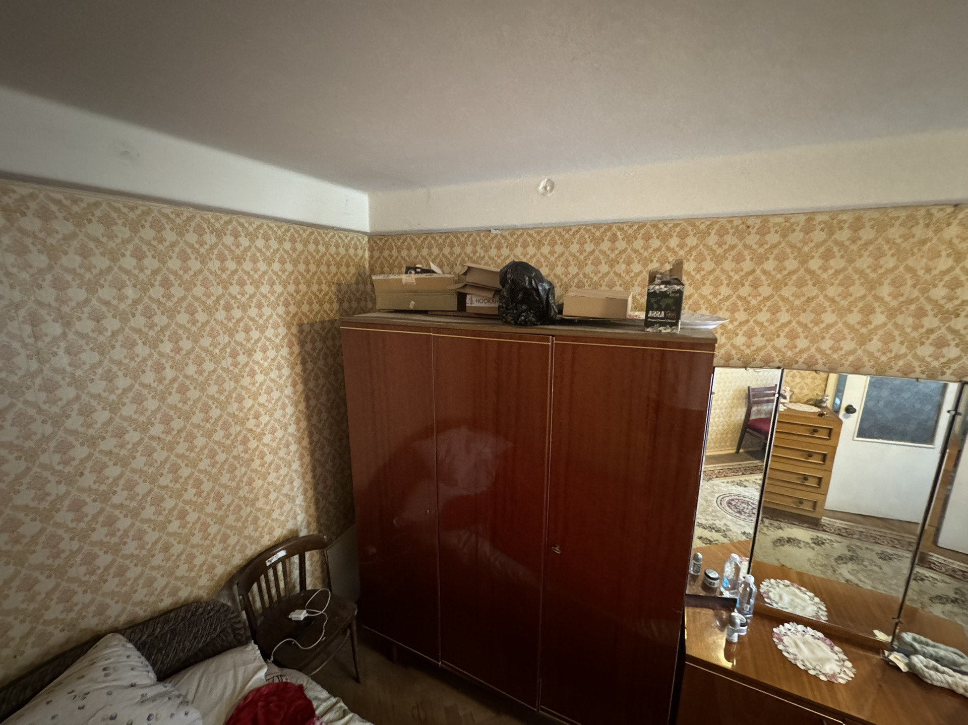 В спальне есть двуспальная кровать, шкаф, зеркало.