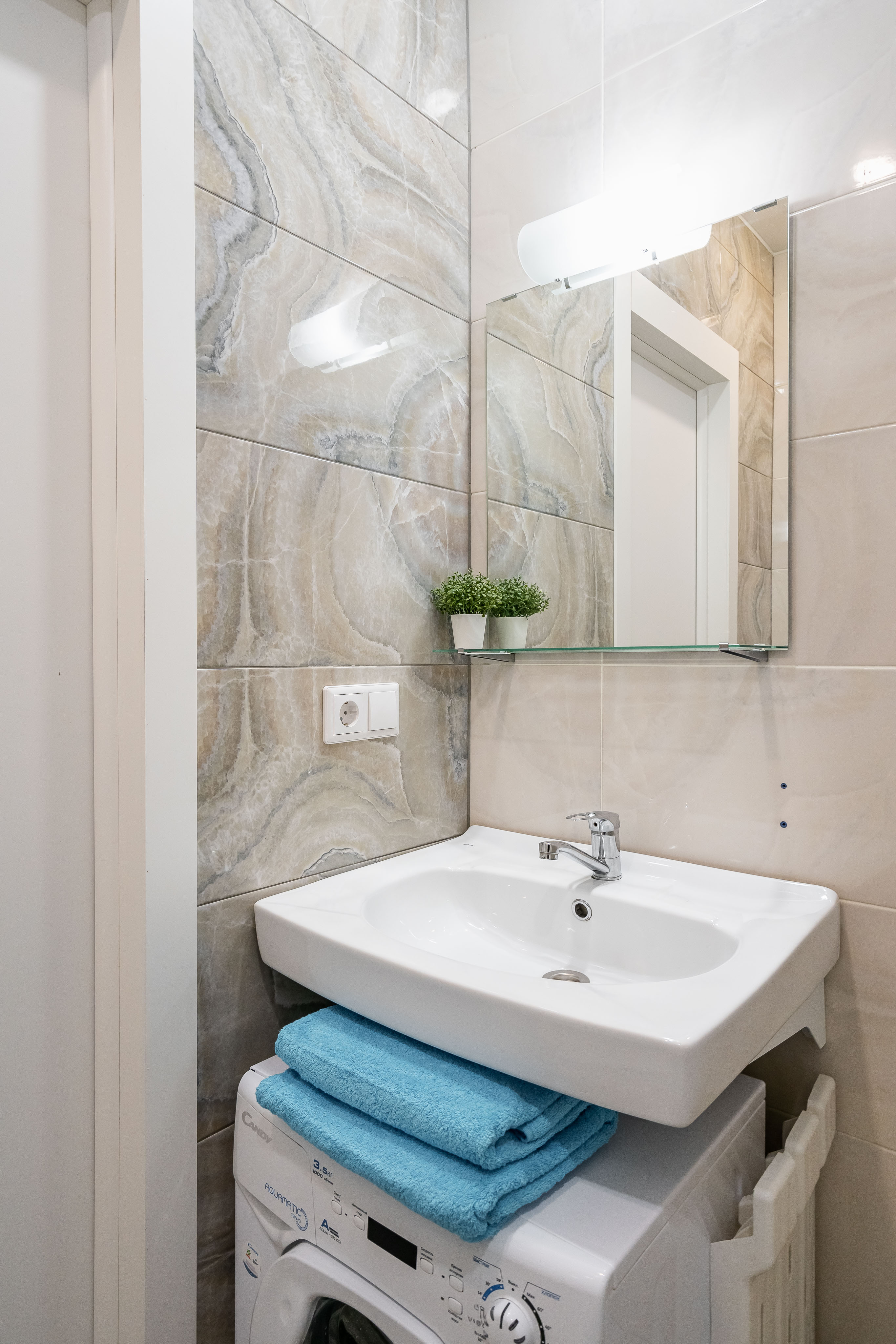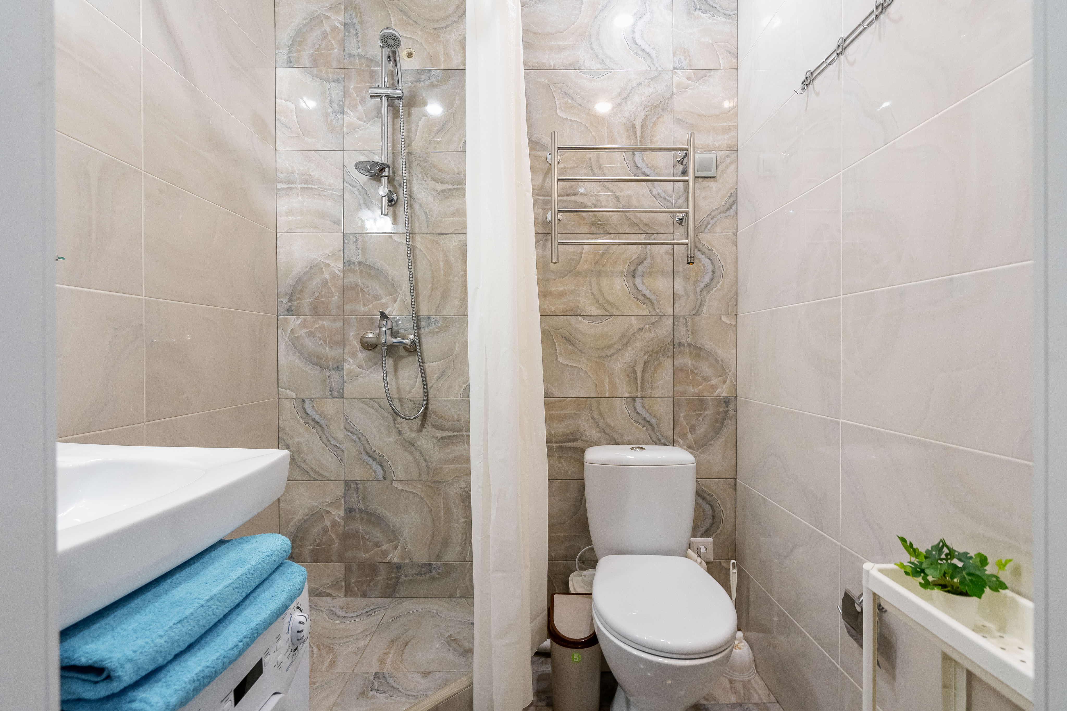 В санузле есть душ, стиральная машина.