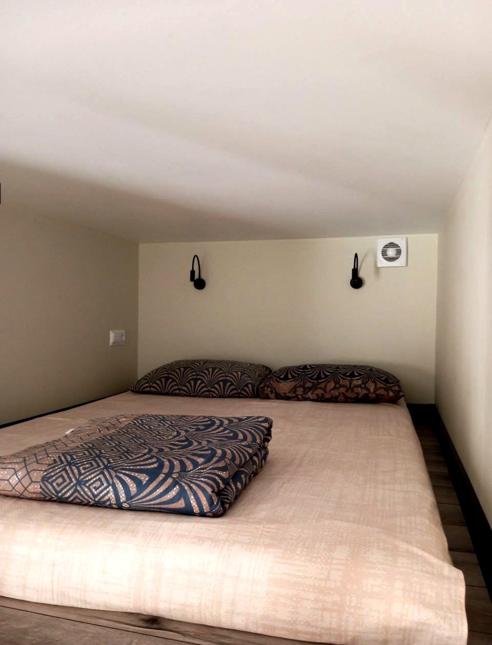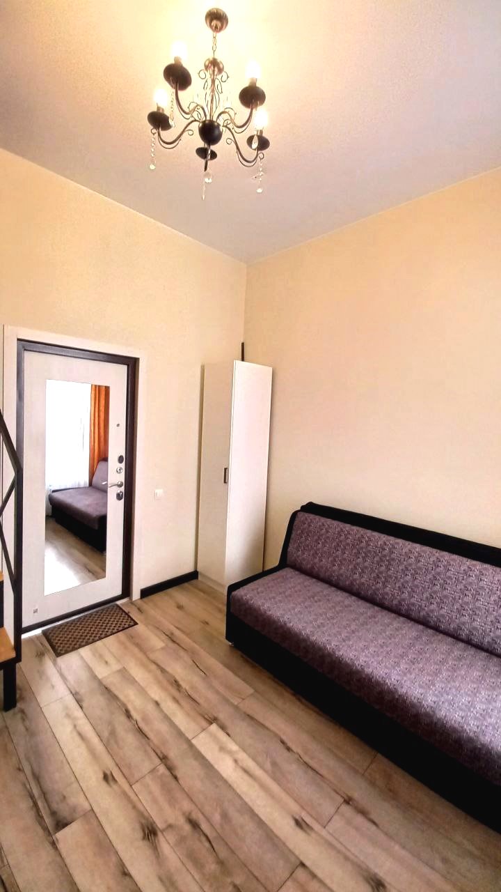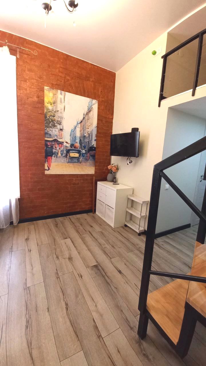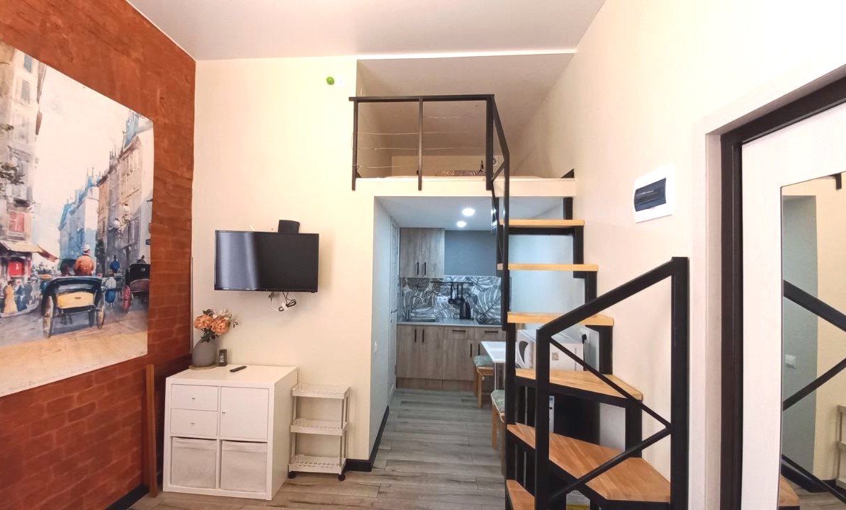 Благодаря высоким потолкам, на верху обустроено дополнительное двухспальное место. Окна во двор, что обеспечивает тишину и спокойствие. Вход в парадную прямо с улицы.