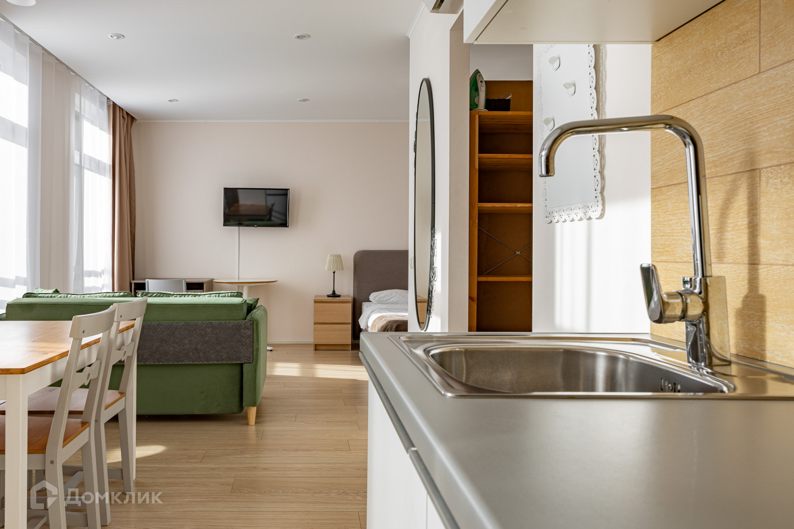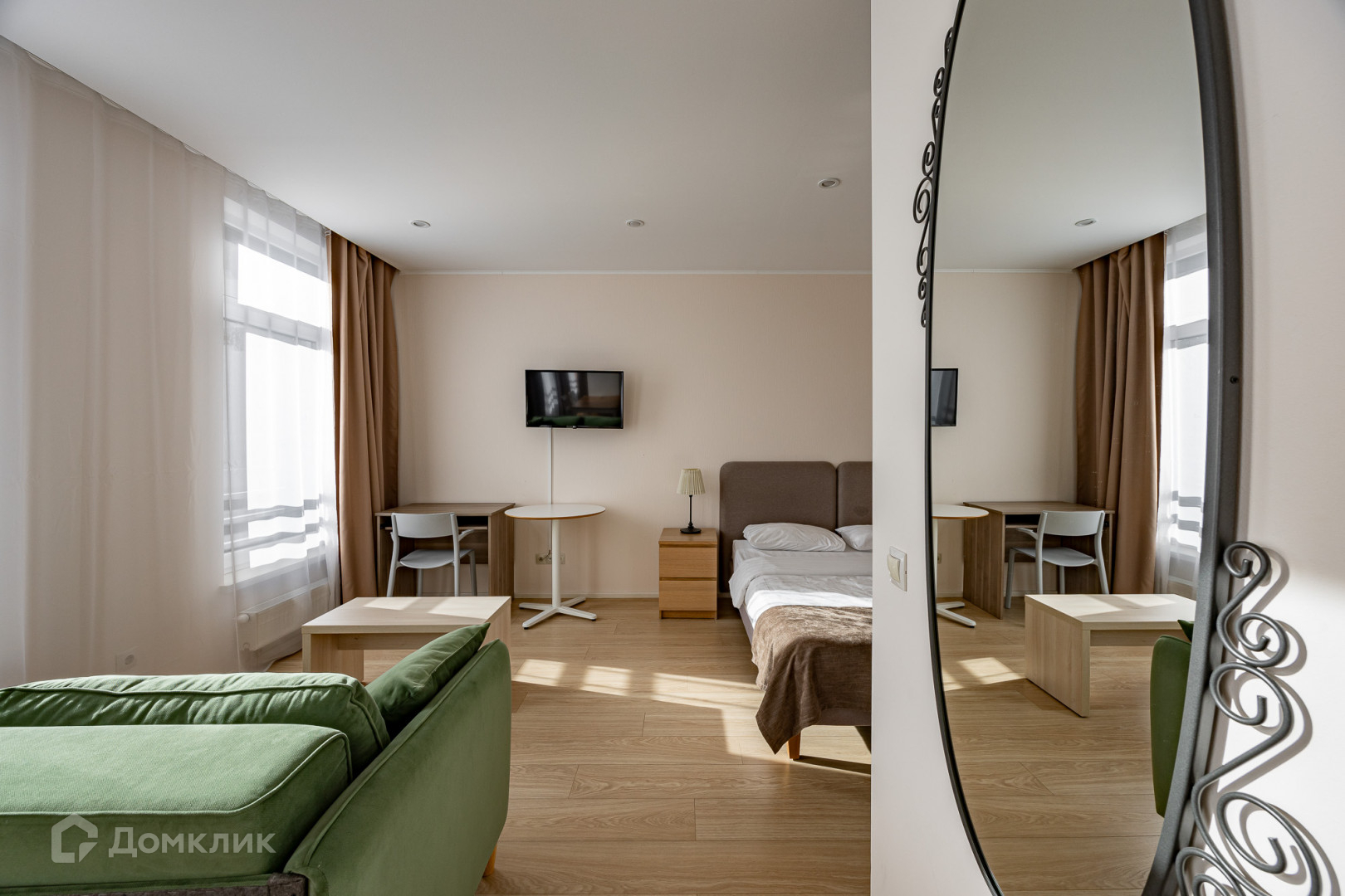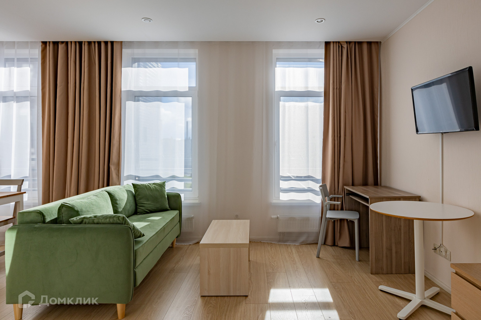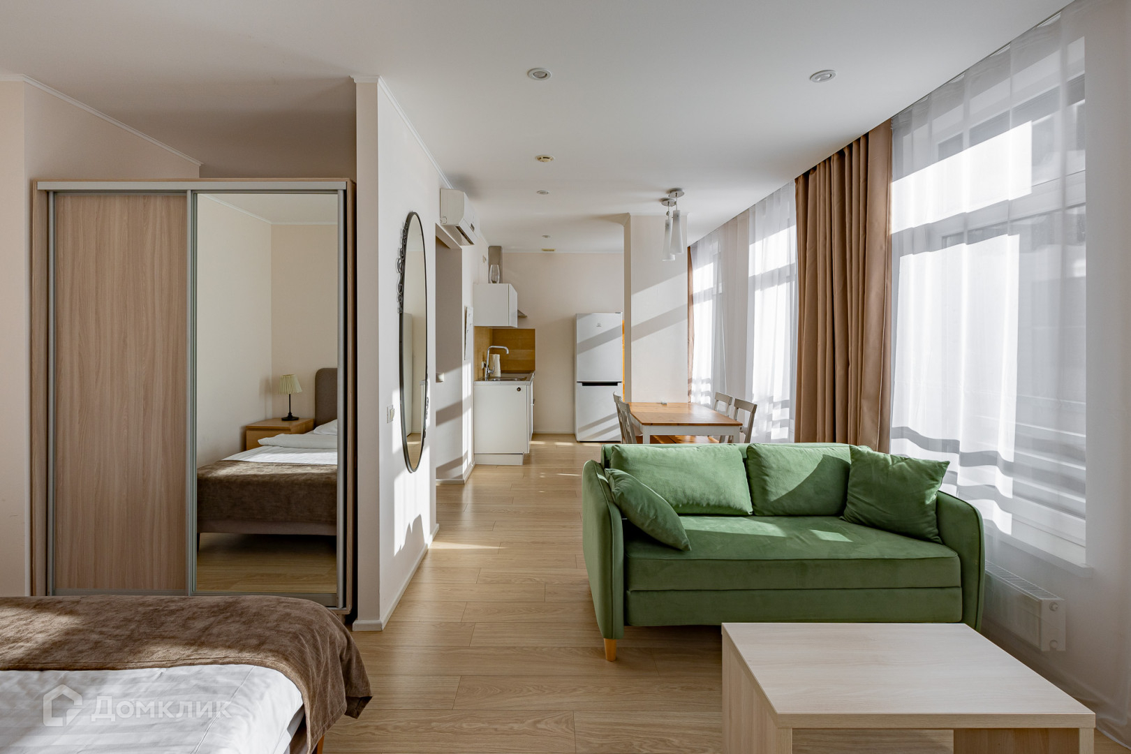 Апартаменты полностью оборудованы мебелью, постельным бельем, посудой, компактной кухней и современной техникой для комфортного проживания.