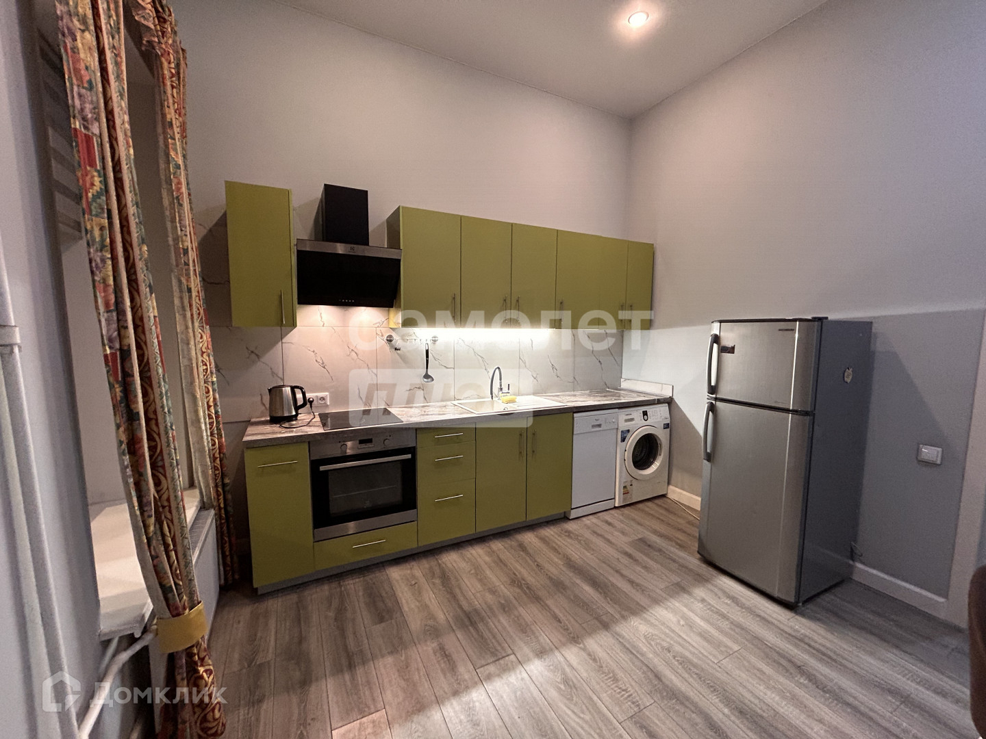 Кухонный гарнитур и техника в отличном состоянии. Присутствует стиральная машина, посудомоечная машина, духовой шкаф, вытяжка и холодильник.