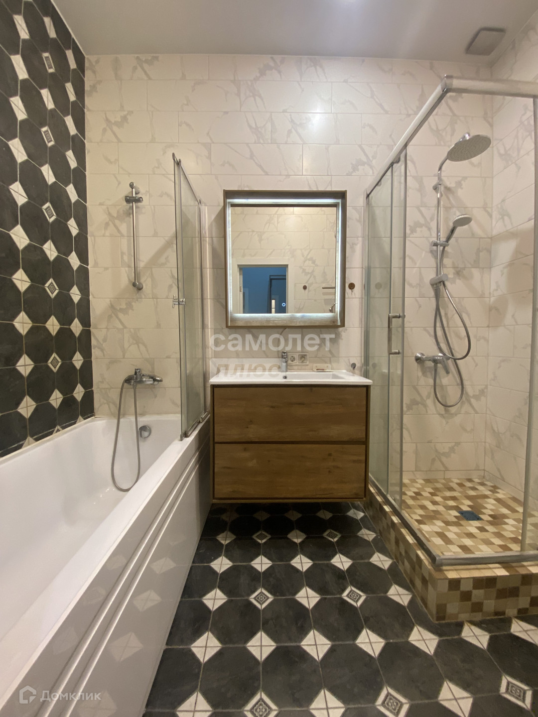 Два санузла: совмещённый — с ванной и душевой, а также второй только с унитазом.