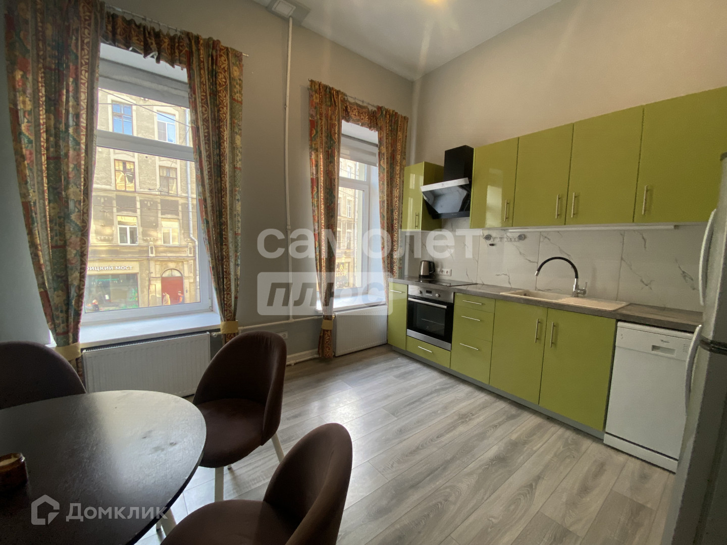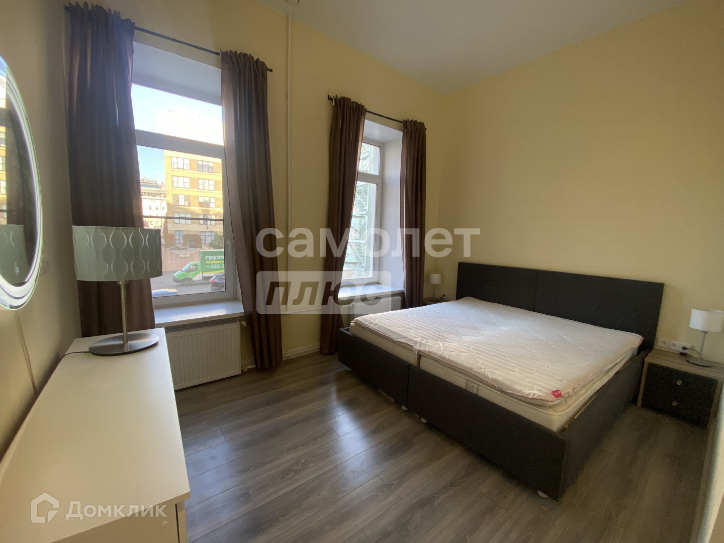 Окна спальни выходят в тихий закрытый двор и из них открывается вид на телебашню. А окна гостиной и кухни выходят на историческую улицу Куйбышева.