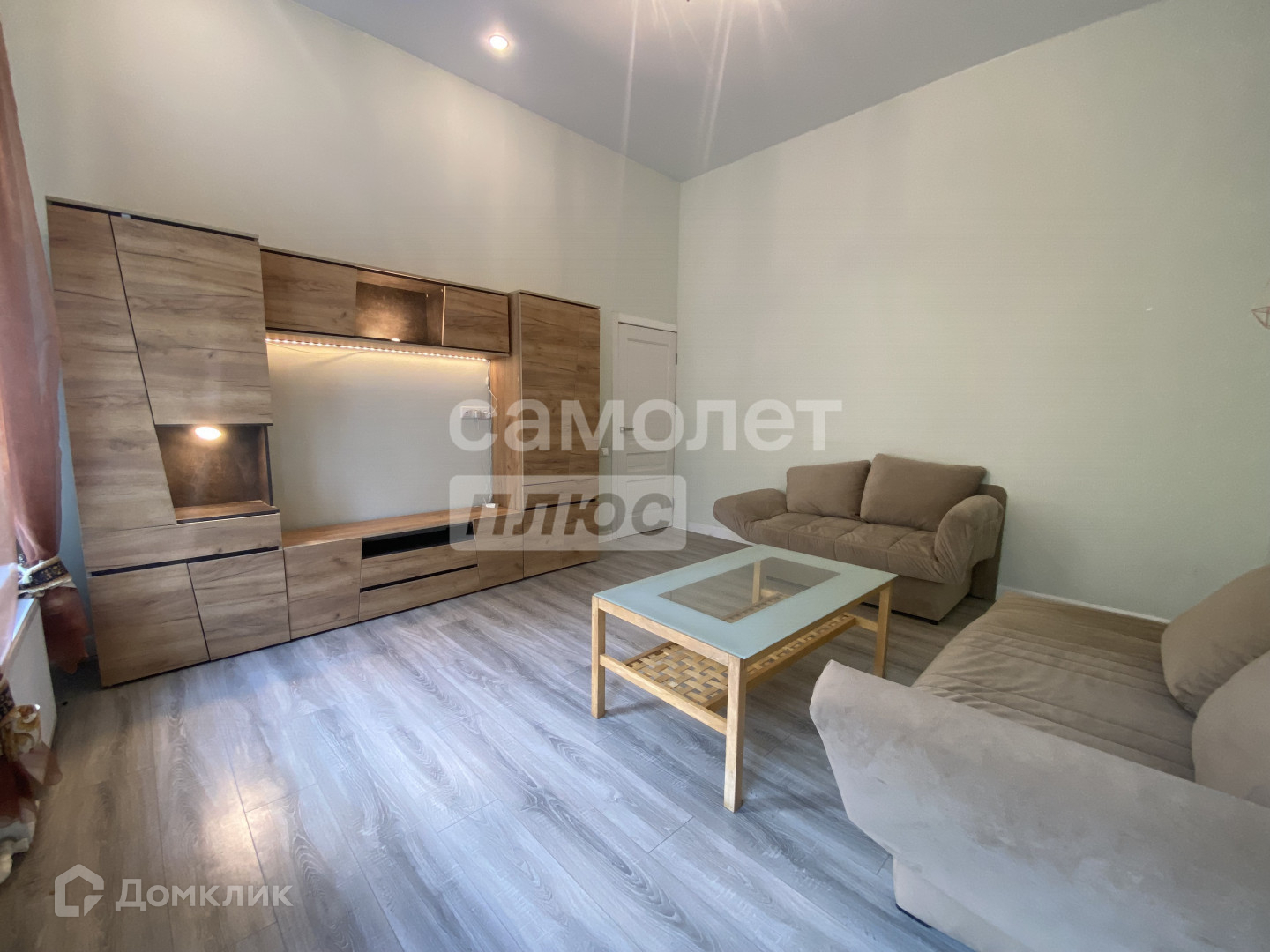 В гостиной два дивана и большая стенка в качестве дополнительного хранения вещей.