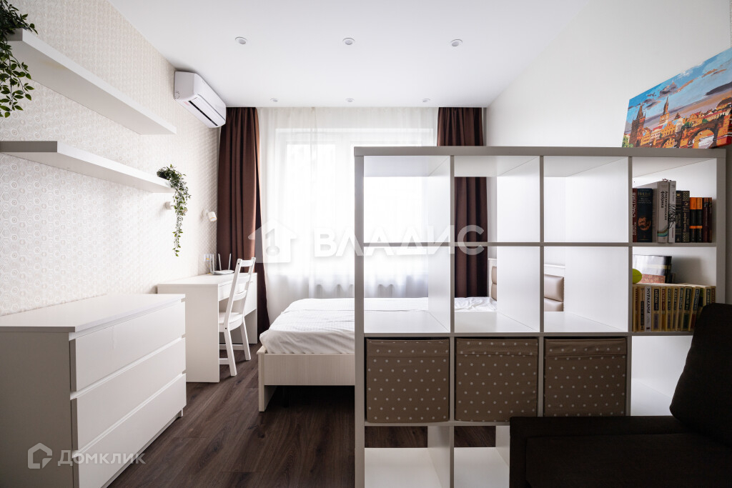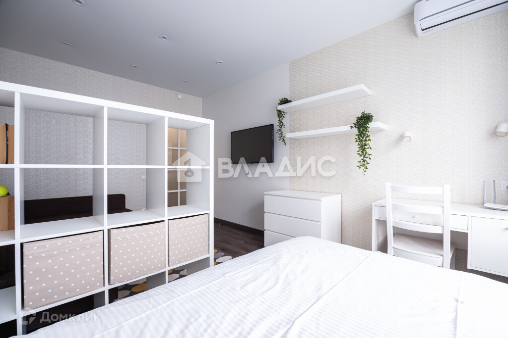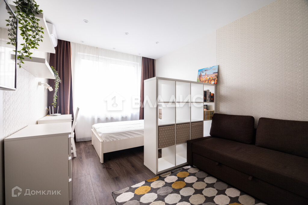 Есть диван, кровать, телевизор и рабочая зона.