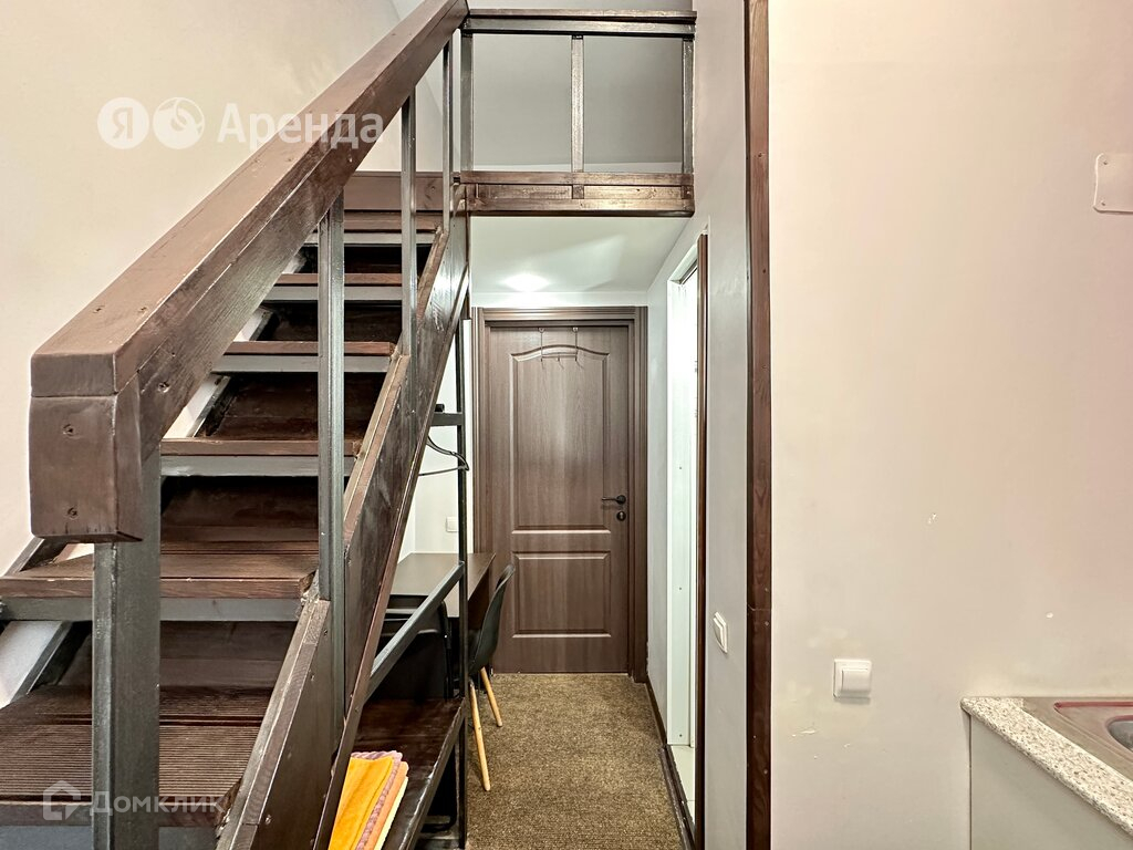 Интерьер: Студия имеет удобную планировку, позволяющую эффективно использовать пространство. В кухне-гостиной установлен компактный гарнитур. Для отдыха и работы есть выделенная зона со столом и стулом. На втором ярусе - двуспальное место для сна с матрасом от «IKEA».