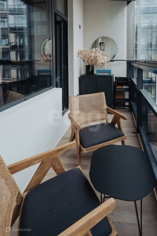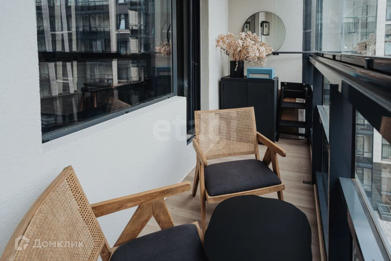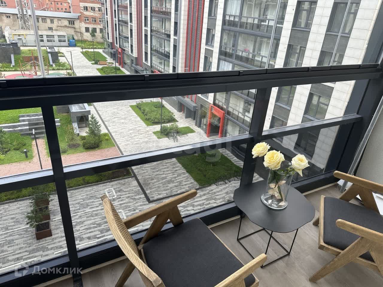 - Просторная лоджия с французскими креслами и видом на спокойный, современный двор.