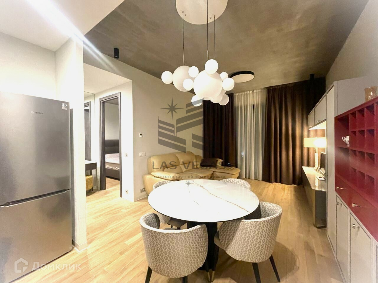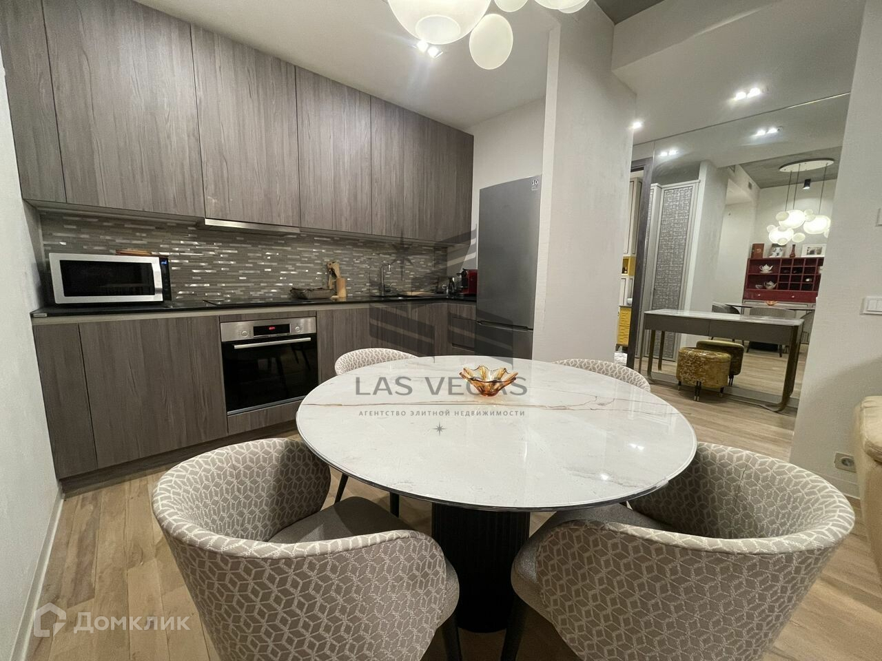 Просторная прихожая выполнена в зеркалах и оснащена вместительным шкафом-гардеробной. Кухня-столовая-гостиная оборудована встроенной бытовой техникой: посудомоечной машиной, духовкой, стиральной машиной. Отдельно стоит вместительный холодильник с морозильной камерой и многофункциональная микроволновая печь премиум-класса.