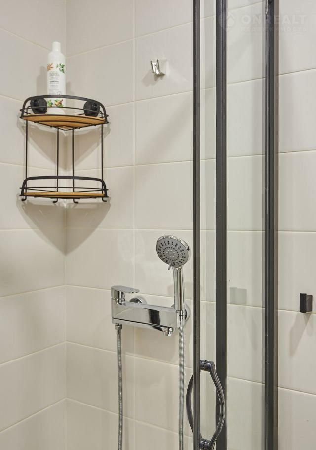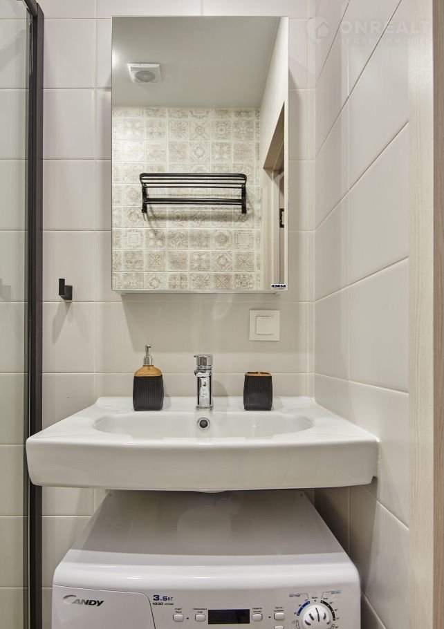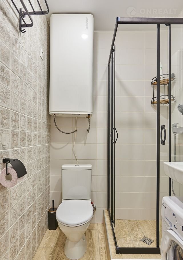 - ванная комната с душевой кабиной и стиральной машиной