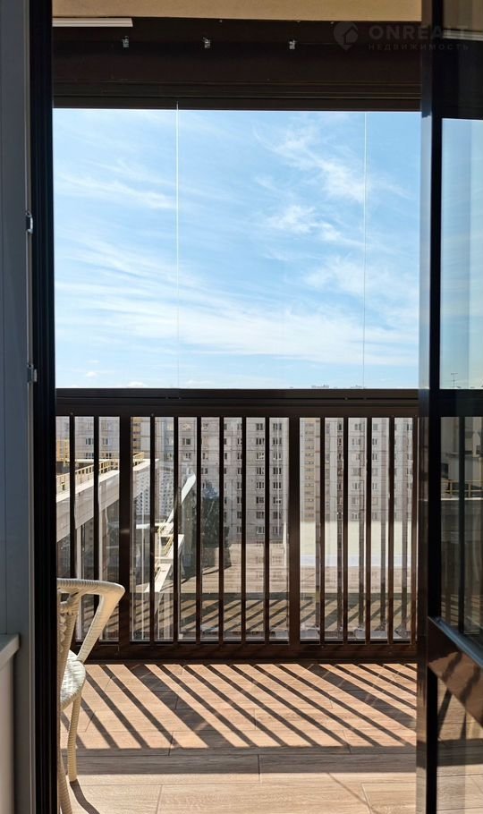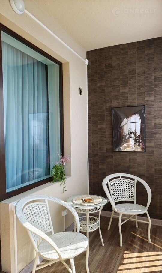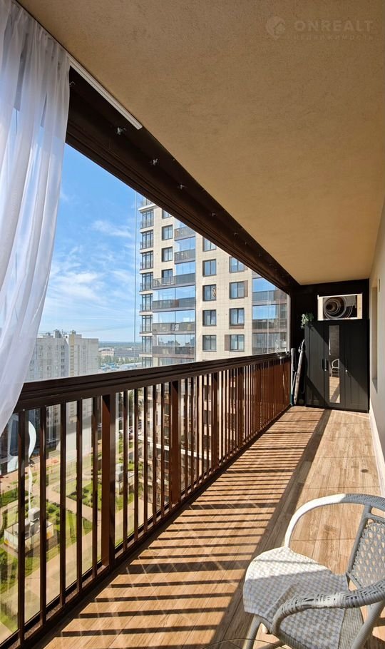 На огромном балконе с панорамный остеклением (12 кв.м) можно отдыхать, работать, любоваться небом и смотреть на самолеты.