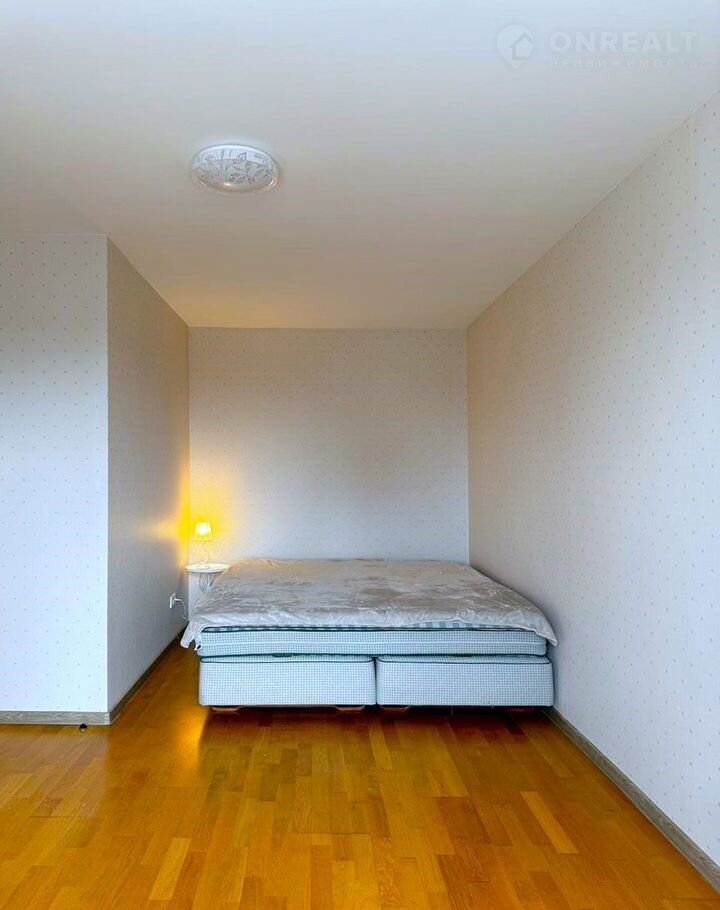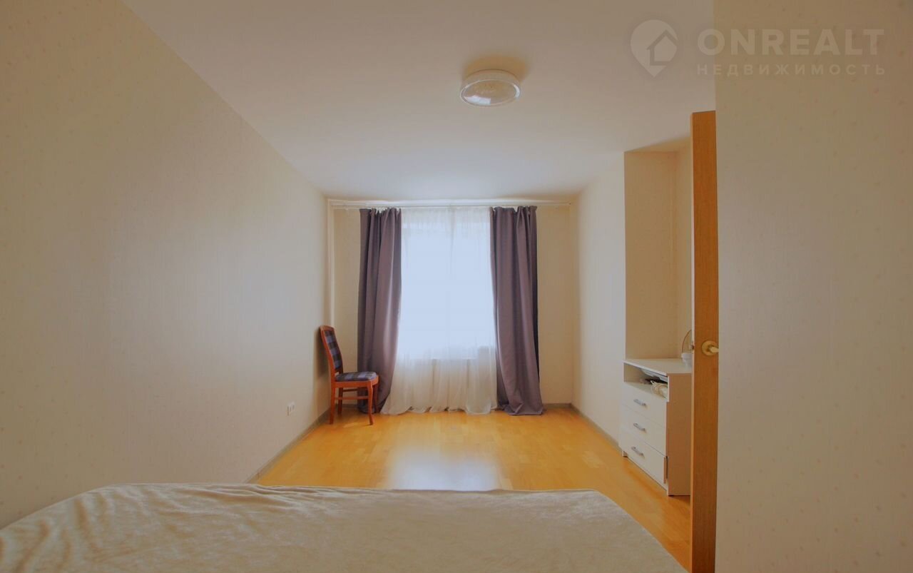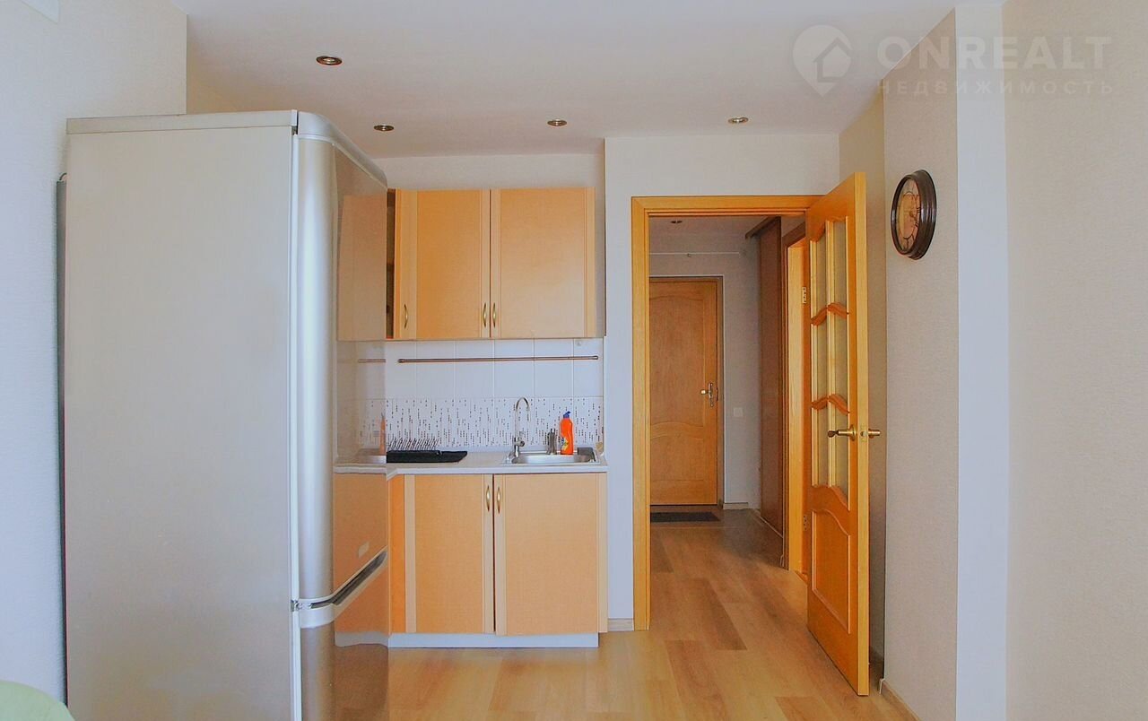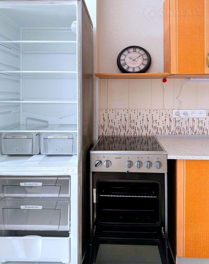 B квapтире есть холодильник, духовой шкаф, стиральная машина. В прихожей установлен 1 шкаф-купе. В гостиной стоит кровать и прикроватный столик.