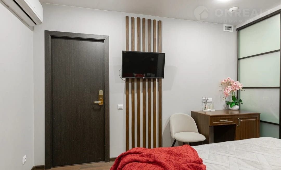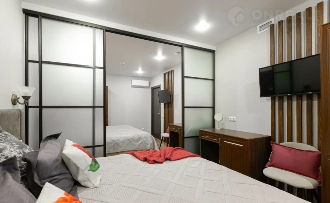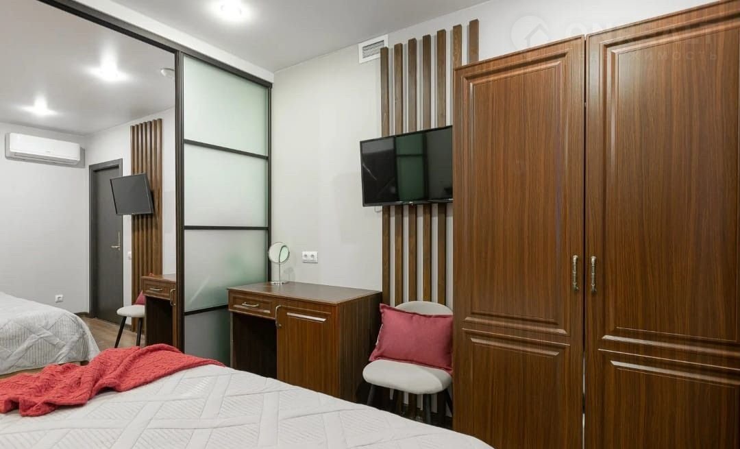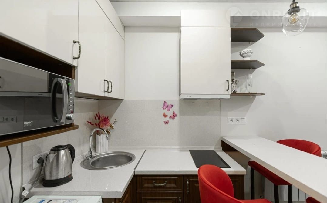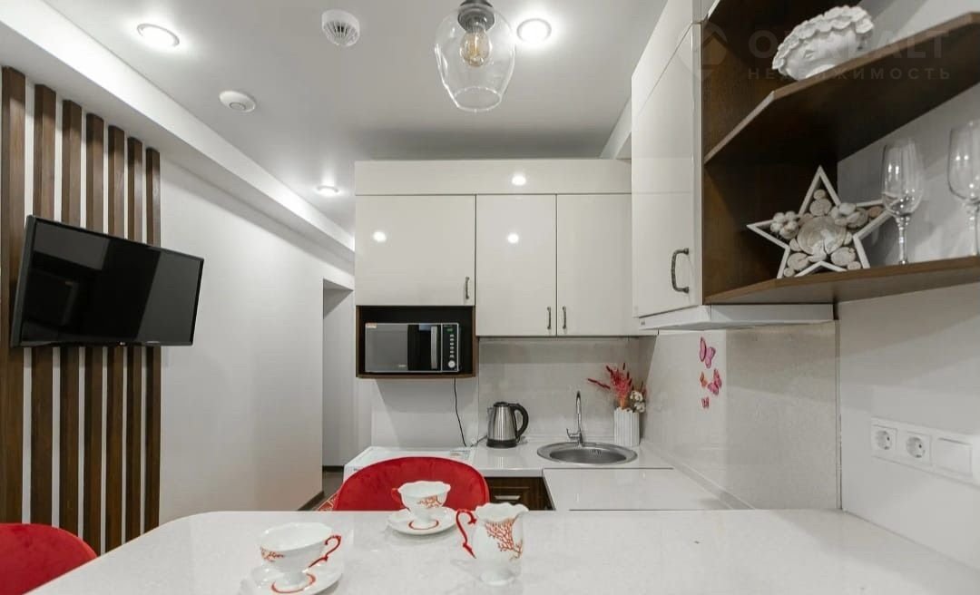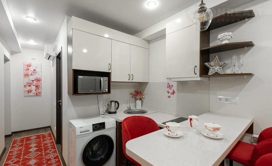 Оборудование: плита, вытяжка, холодильник, кондиционер, посуда на 4-е персоны, чайник и микроволновка.