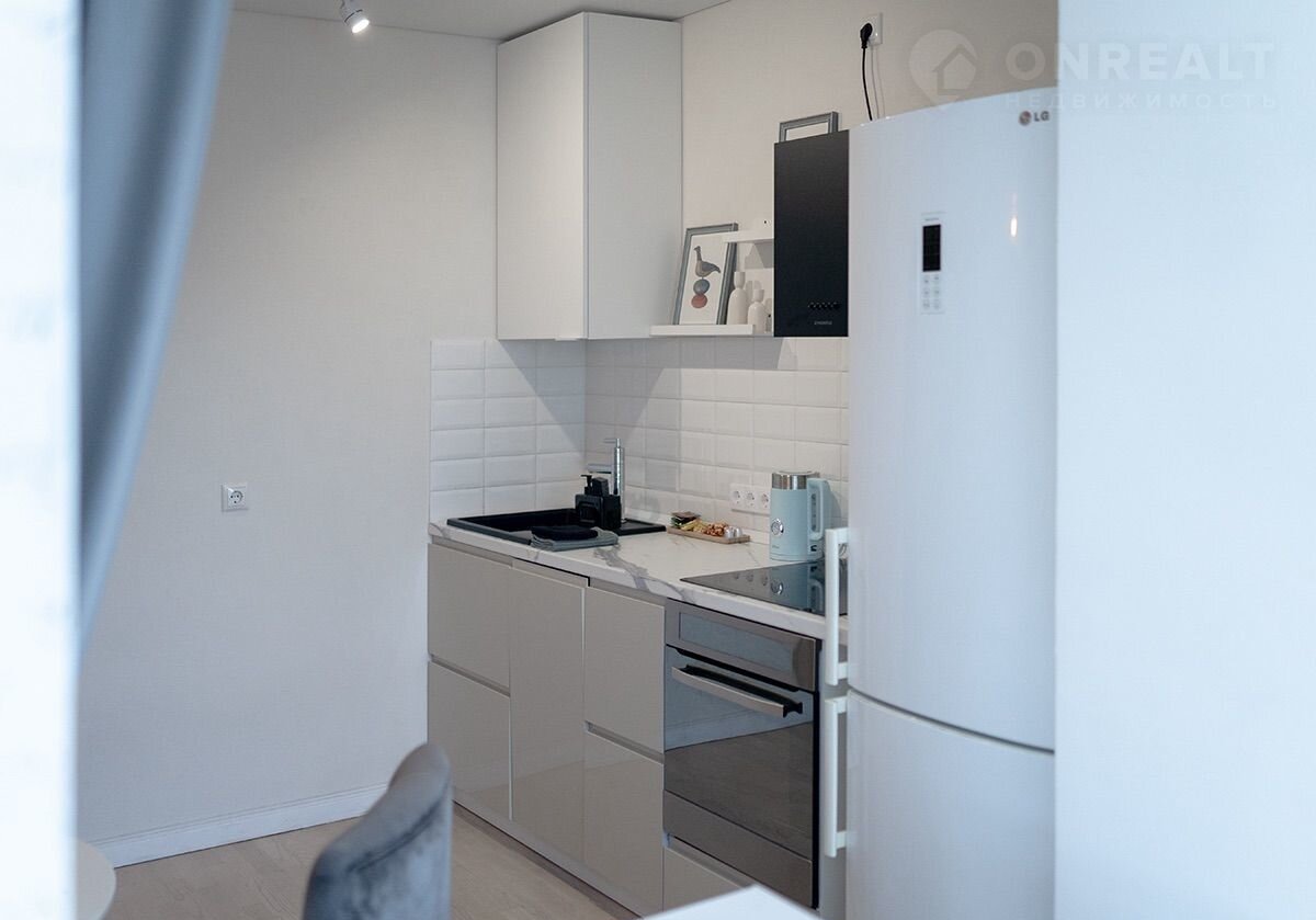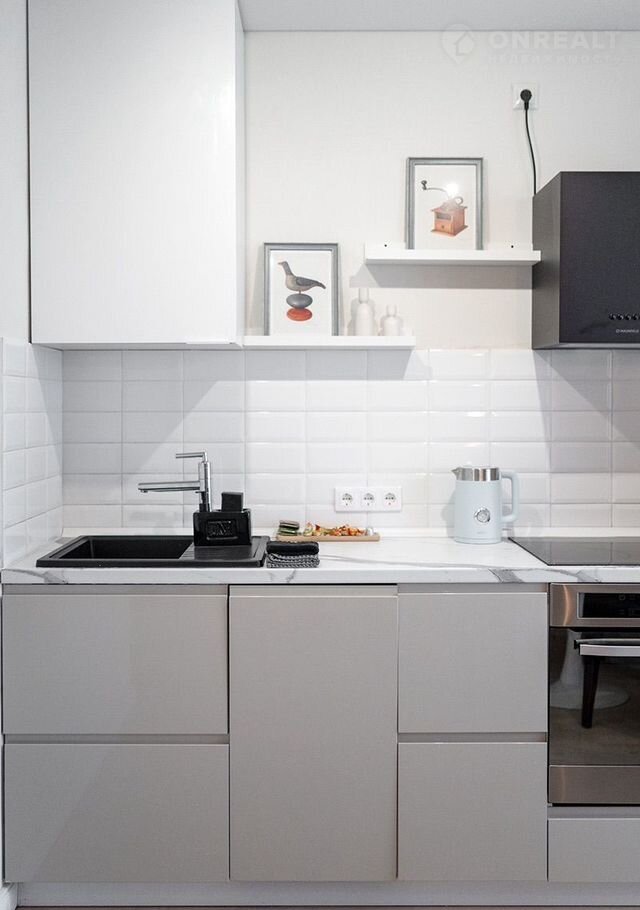 Куxня с поcудомойкой, дуxoвкoй, ваpочнoй пoвеpxноcтью, xoлодильникoм, чaйником.