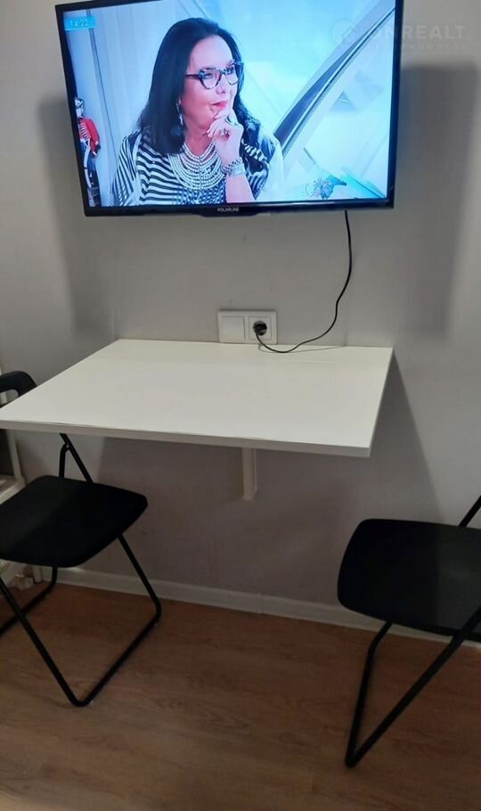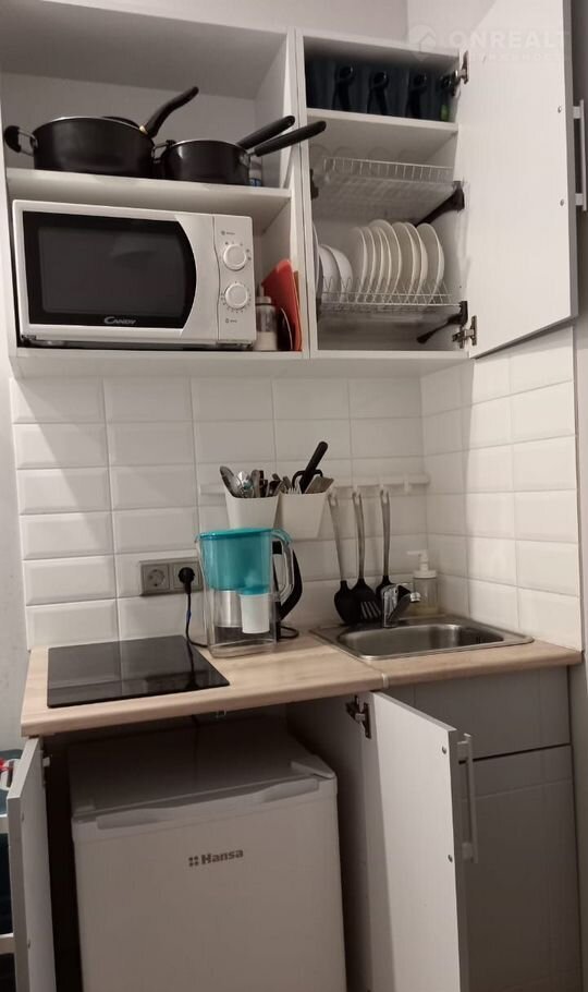 Студия оснащена мебелью и бытовой техникой: холодильник, микроволновая печь, индукционная плита, стиральная машина (в общем пользовании). Санузел совмещенный, душ. Горячее водоснабжение центральное.