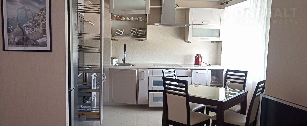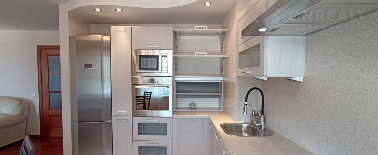 В кухне площадью 22 кв. м., расположен кухонный гарнитур со встроенной техникой: варочная поверхность, духовой шкаф, посудомоечная машина, микроволновая печь, холодильник, а также установлена система дополнительная очистки для питьевой воды.