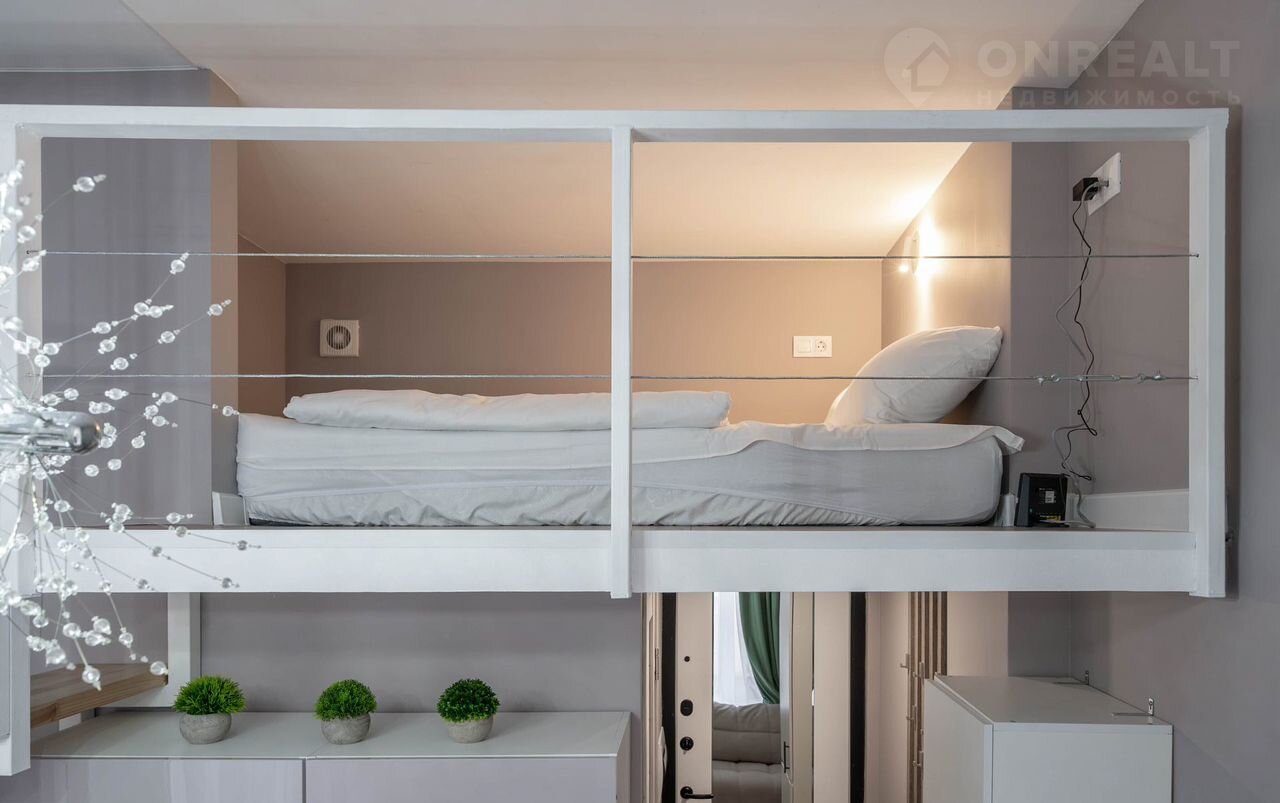 - Площадь студии составляет 12 м² + 4 м² второго яруса, который является спальным местом.