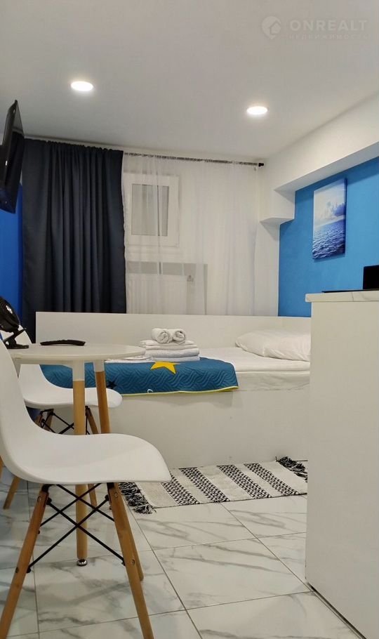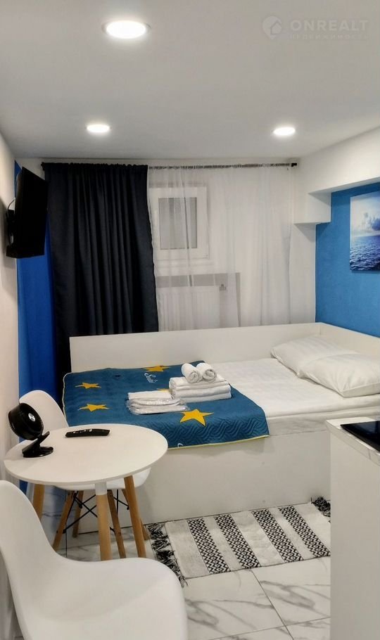 Студия находится на цокольном этаже , где так же целый этаж маленьких уютных студий. В квартире есть все необходимое для проживания. Кровать не большая , но очень удобная, два человека вполне помещаются.