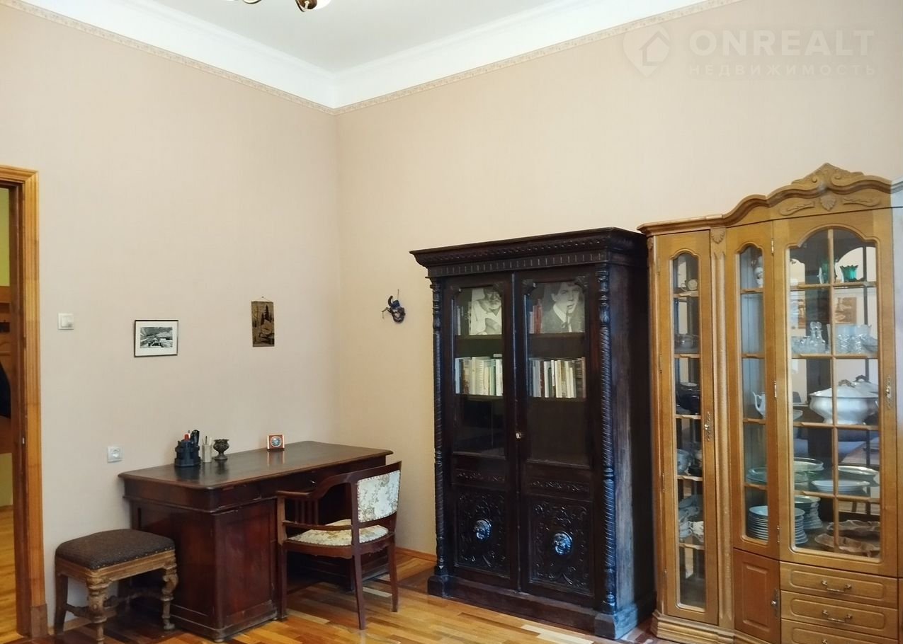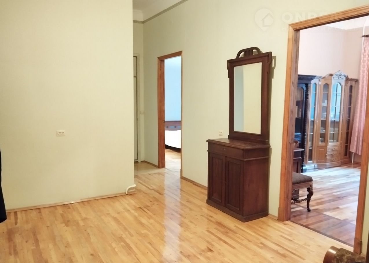 В квартире полностью сделан ремонт. Высота потолков 3.30, в комнатах по 2 окна. Окна выходят в тихий двор. При входе в квартиру- просторный холл с огромным зеркалом и креслами. Кухня-столовая 11.8 кв м с круглым столом и лампой над ним для приятных ужинов. Есть холодильник, плита, посудомоечная машина. Гостиная-кабинет с старинным письменным столом и большим диваном для работы и общения. Спальня в стороне от кухни и гостиной. Есть кладовая и гардеробная ( с сушилкой для белья, гладильной доской и прочим нужным для жизни).