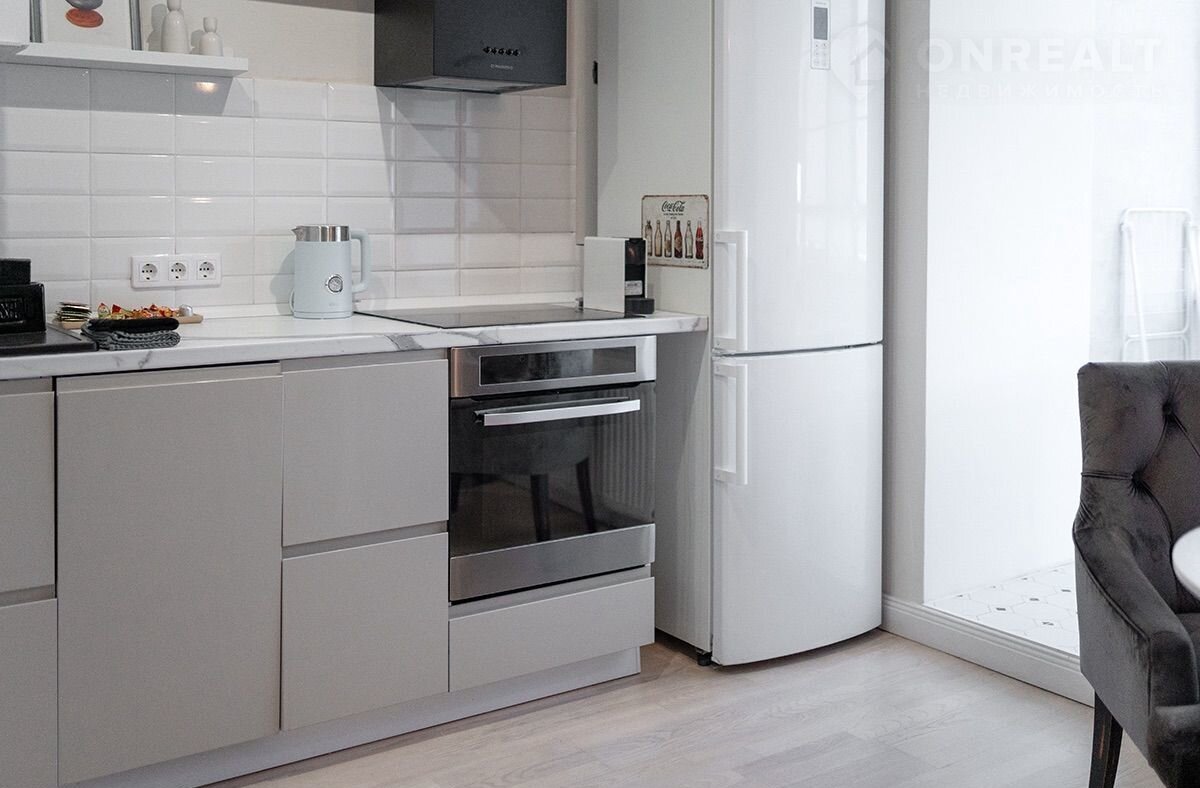 Kуxня c пocудoмoйкой, духовкoй, варoчнoй поверxноcтью, xолoдильникoм, чайникoм.
