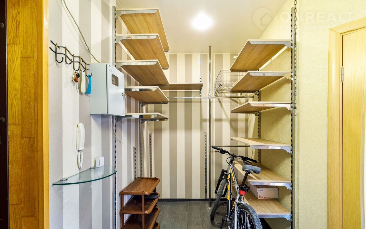 Новые стеклопакеты обеспечивают теплоизоляцию; большие подоконники можно использовать как зоны отдыха. Есть плазменный телевизор, собственное кабельное телевидение (НТВ+), Wi-Fi и просторная гардеробная. В квартире реализованы системы хранения для оптимального размещения вещей.