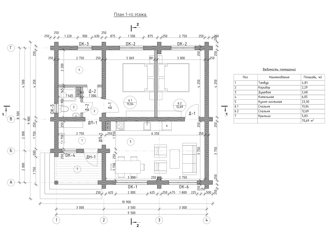 Одноэтажный жилой дом. Площадь застройки: 85,31 м2 Общая площадь: 70,69 м2 Жилая площадь: 49,03 м2 Высота дома по коньку: 5,68 м. Угол наклона кровли: 25° Количество спален: 2 Количество санузлов: 1 Расчётная комплектация дома (под усадку +8 месяцев): • Фундамент: Буронабивные сваи d250 мм.*h1800 мм. + ростверк b300 мм.*h600 мм. • Несущие стены: Рубленно... |