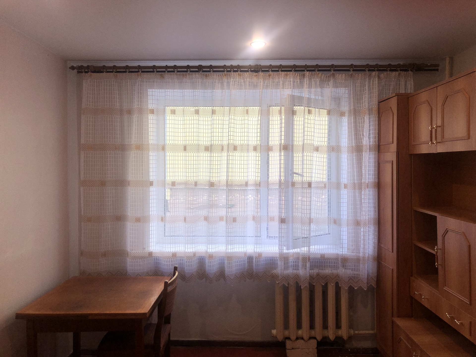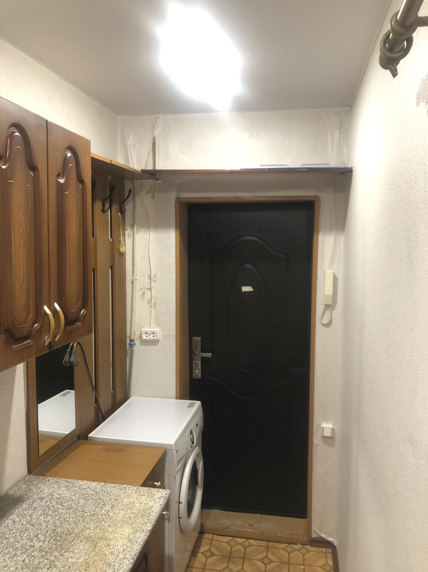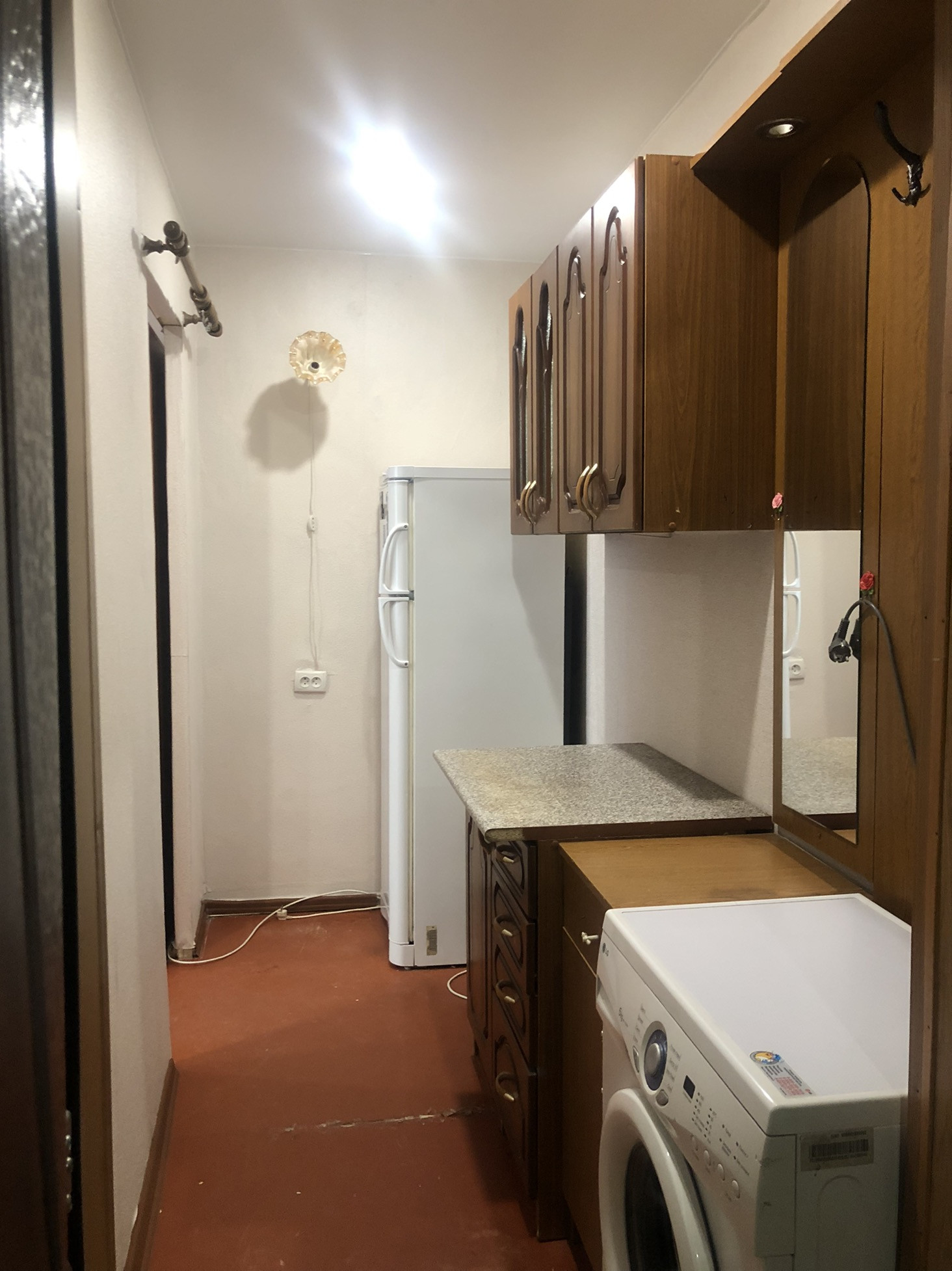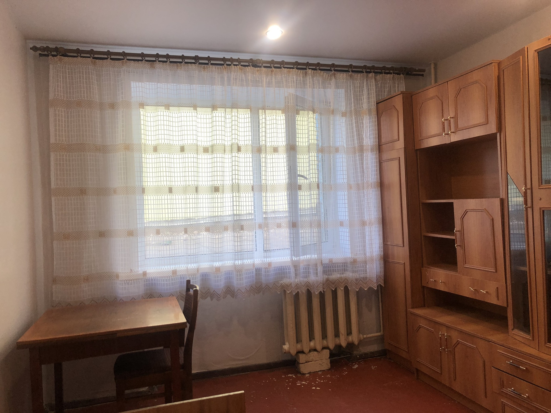 В комнату проведена вода под стиральную машинку, натяжные потолки, пластиковое окно. Комната разделена под небольшую кухню. Вся мебель и техника(холодильник, стиральная машинка, телевизор) остаётся в комнате.